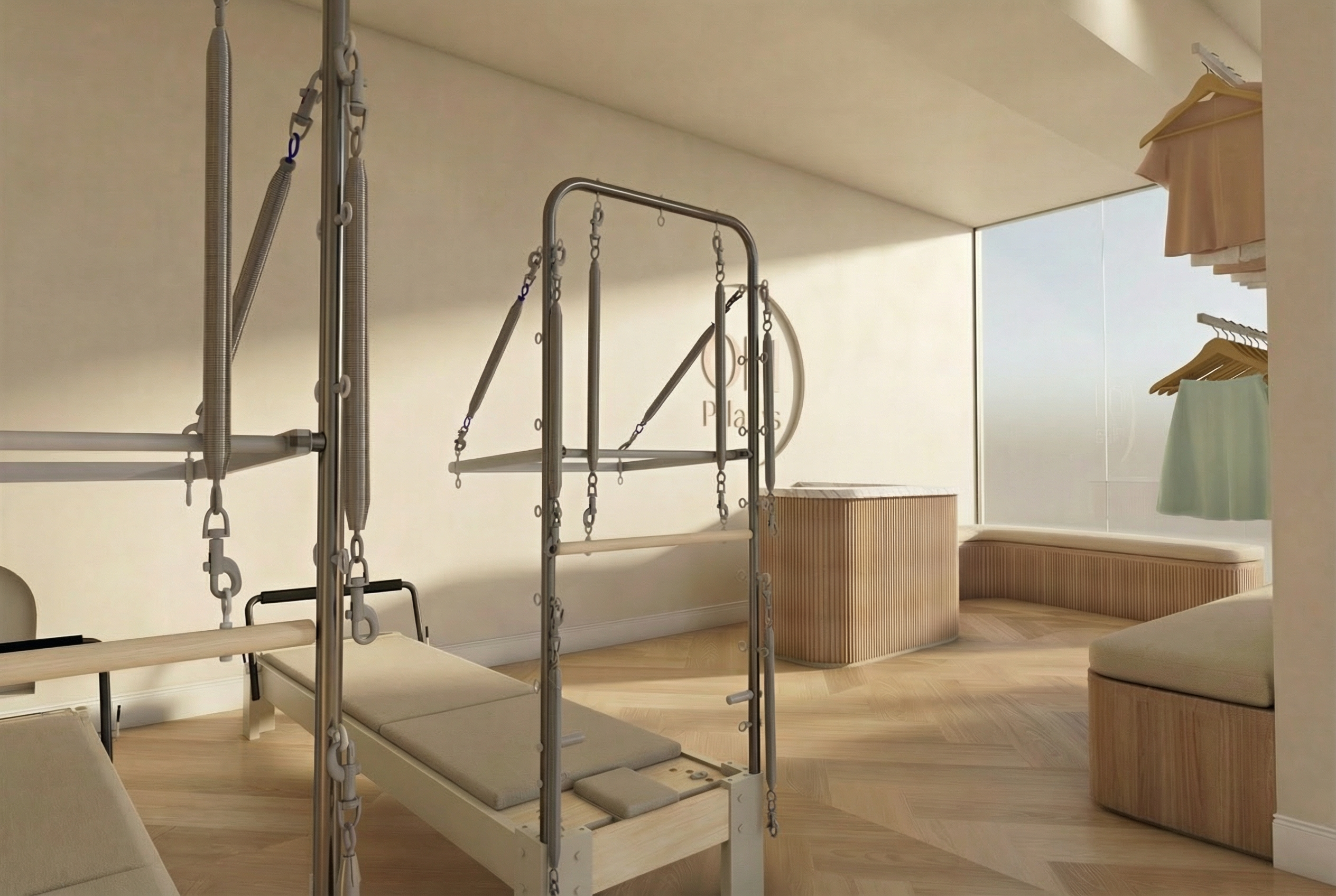 refine the existing image without changing camera angle layout or overall composition apply the following corrections exactly logo on back wall bench under clothing right side remove the bench completely from beneath the hanging clothes leave the area clean and minimal with only the clothing rack visible branding on pilates equipment remove all balanced body text and logos from the reformer machines replace with no visible branding at all clean unbranded equipment maintain plaster wall finish behind the desk single large glass panel window cushion on the main curved bench all lighting materials and overall warmth do not add new elements do not change layout only apply these corrections