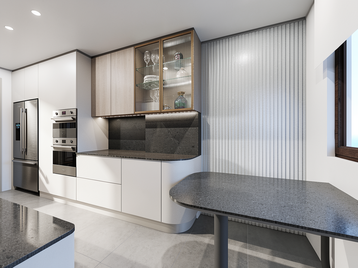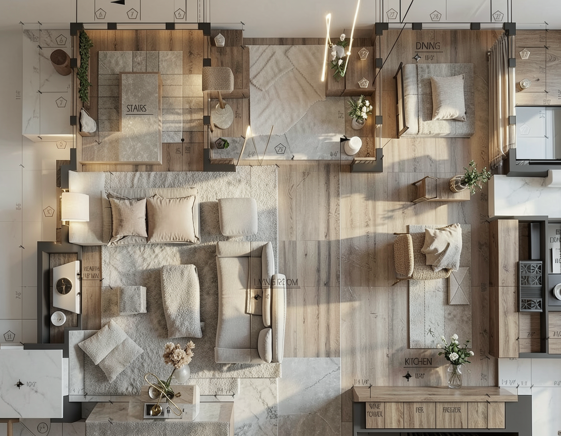 render a cozy interior room with white walls and a knotty pine wooden door in light honey brown highlight rustic pine wooden beams on the ceiling with a warm oak finish create a soft inviting atmosphere with a glowing pendant lamp casting a gentle yellow light showcase a window with a dark knotty pine frame revealing an outside view of lush green grass and vibrant foliage place a tiny home type kitchen in the corner in knotty pine wood with a dark granite counter top add texture with a light gray stone wall section contrasting the warm honey toned wooden flooring