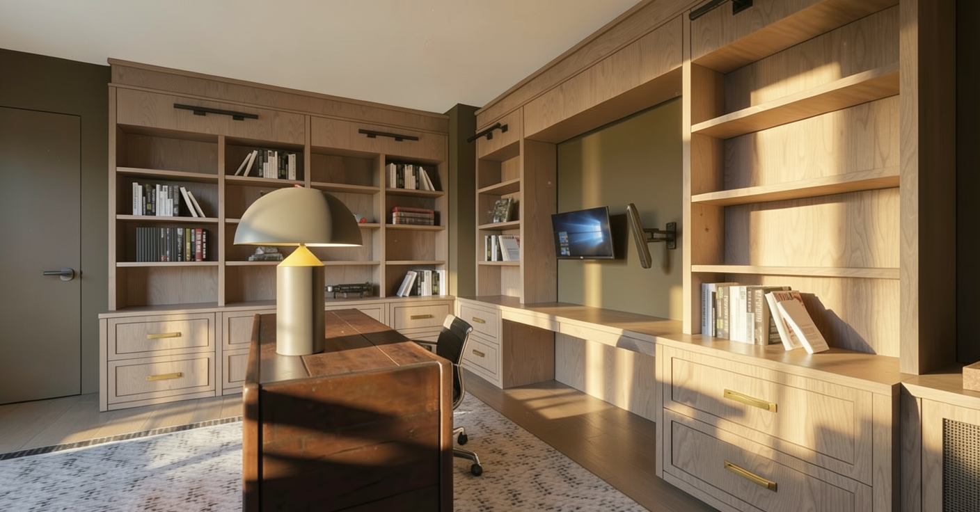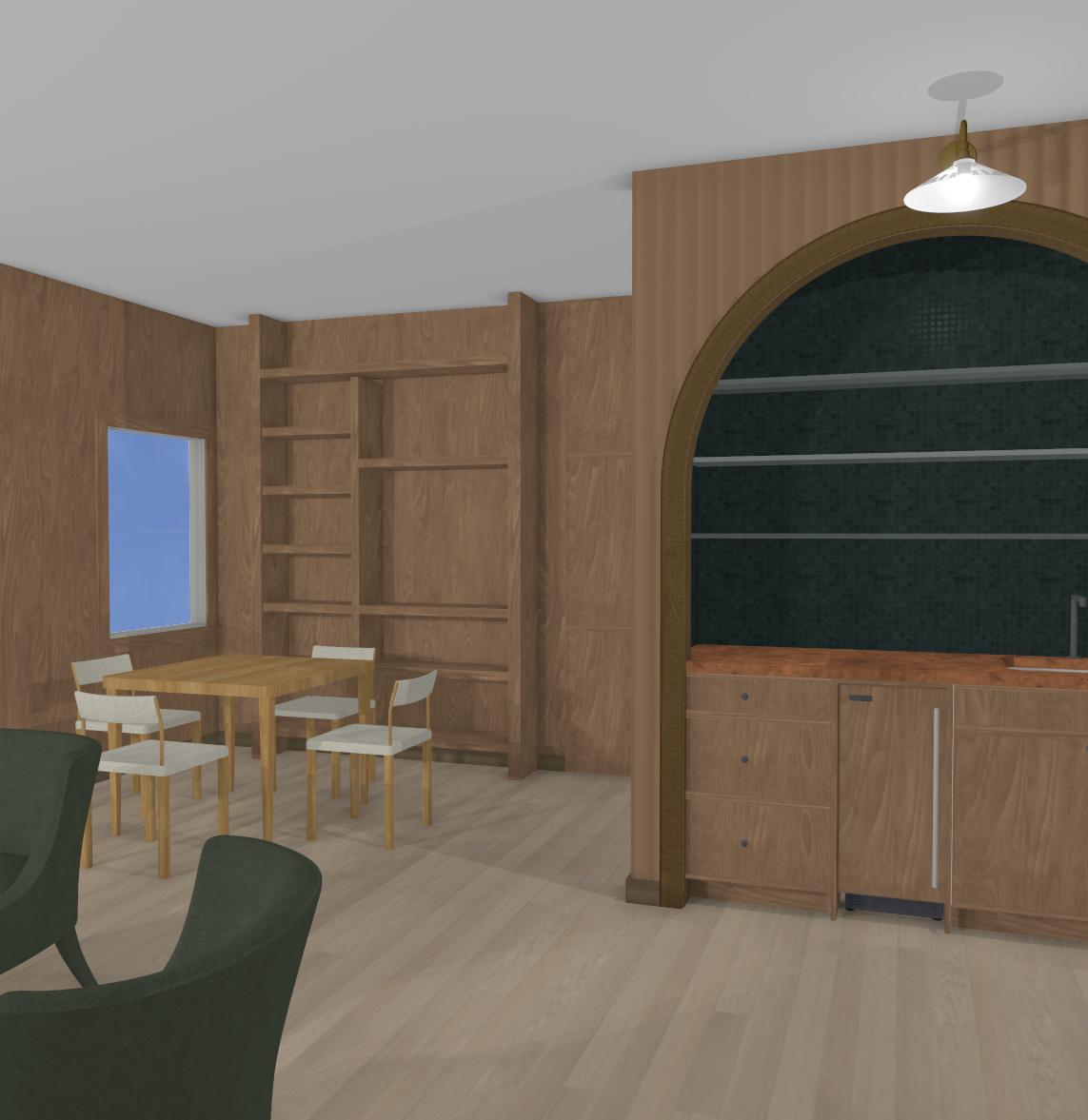 speakeasy with built in bar with green zelliage tile and copper top wood paneling on walls and built in shelving for mahjong table light white oak floors and wooded view out window
