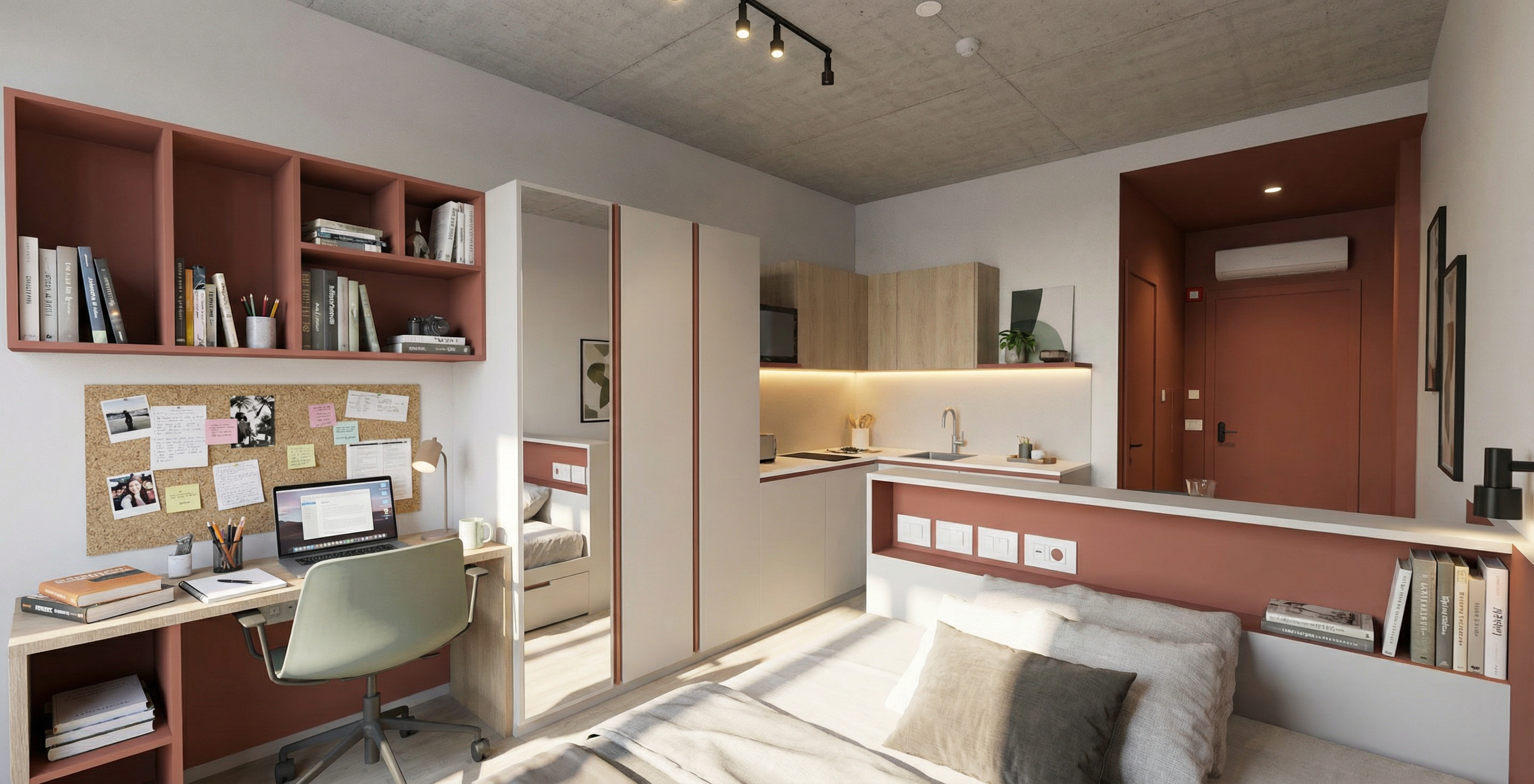 arreda come uno studente universitario soffitto liscio grigio chiaro strip led sotto pensile cucina sedia scocca plastica verde salvia prima anta armadio specchio