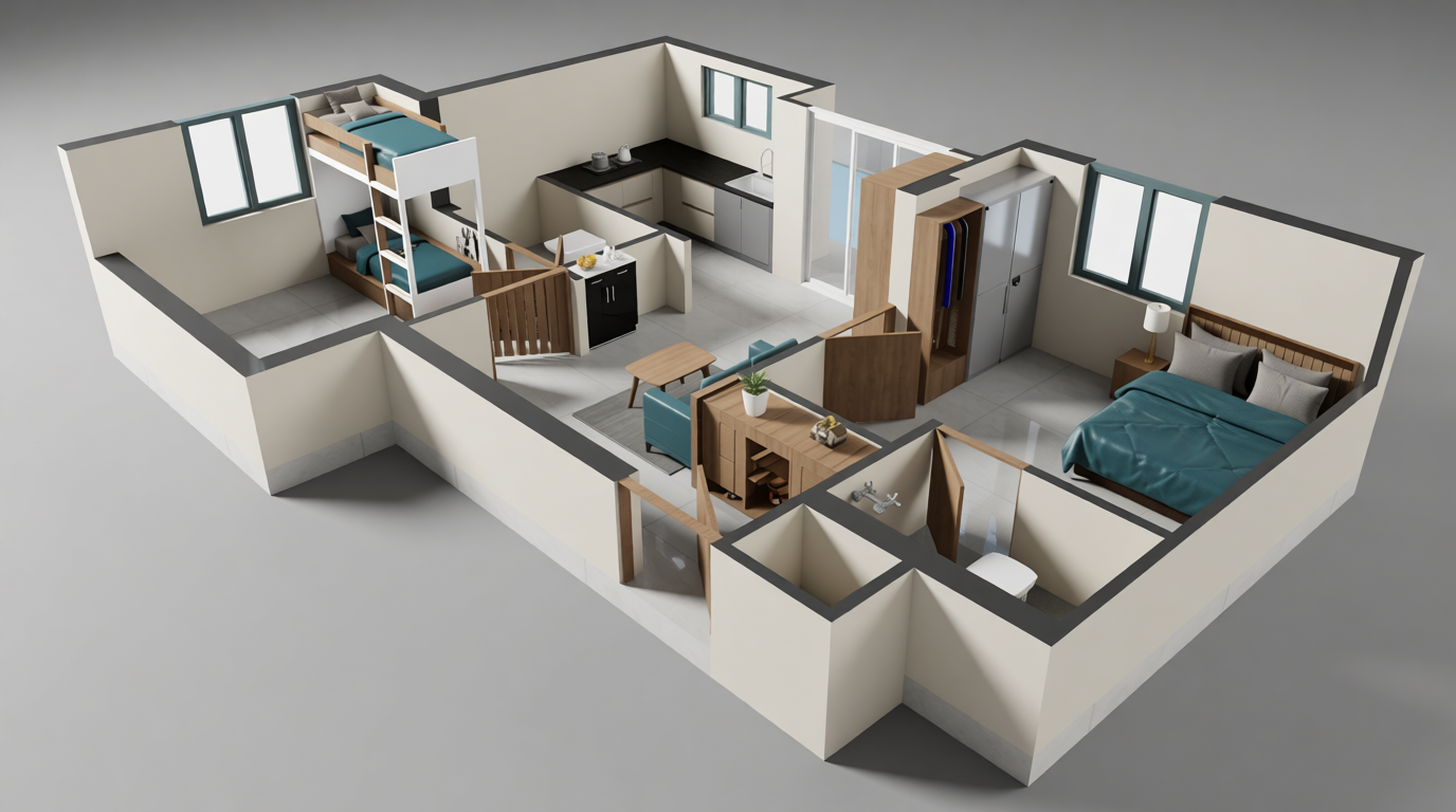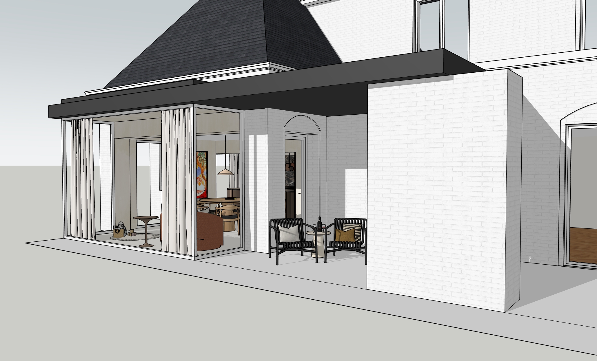 highly realistic architectural rendering of a residential building the facade features white painted brick with subtle texture the canopy is a sleek modern element made of black aluminum the windows have wooden frames finished in white lacquer the terrace is finished with large format gray stone tiles in front of the terrace an organically designed garden with natural shapes grass and layered shrubs creates a soft natural transition maintain the existing materials proportions and overall composition of the original design soft natural daylight contemporary architectural style high detail