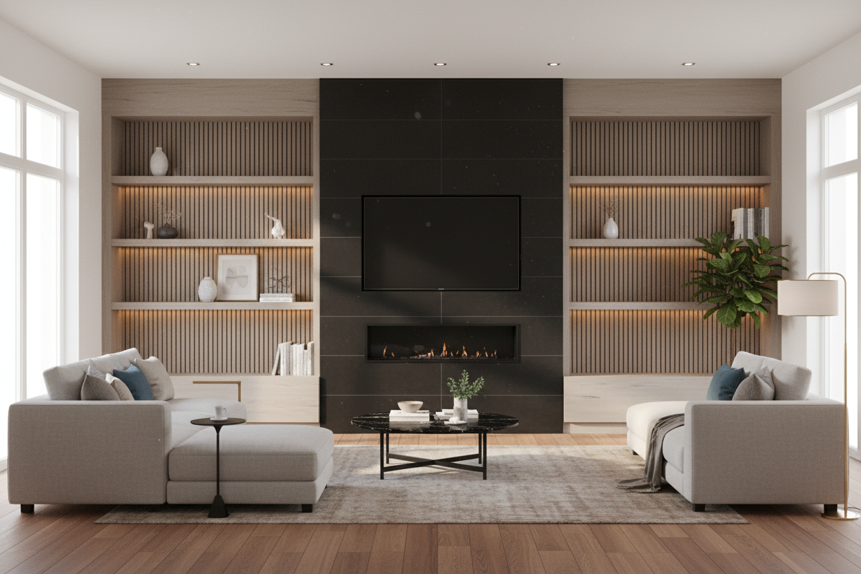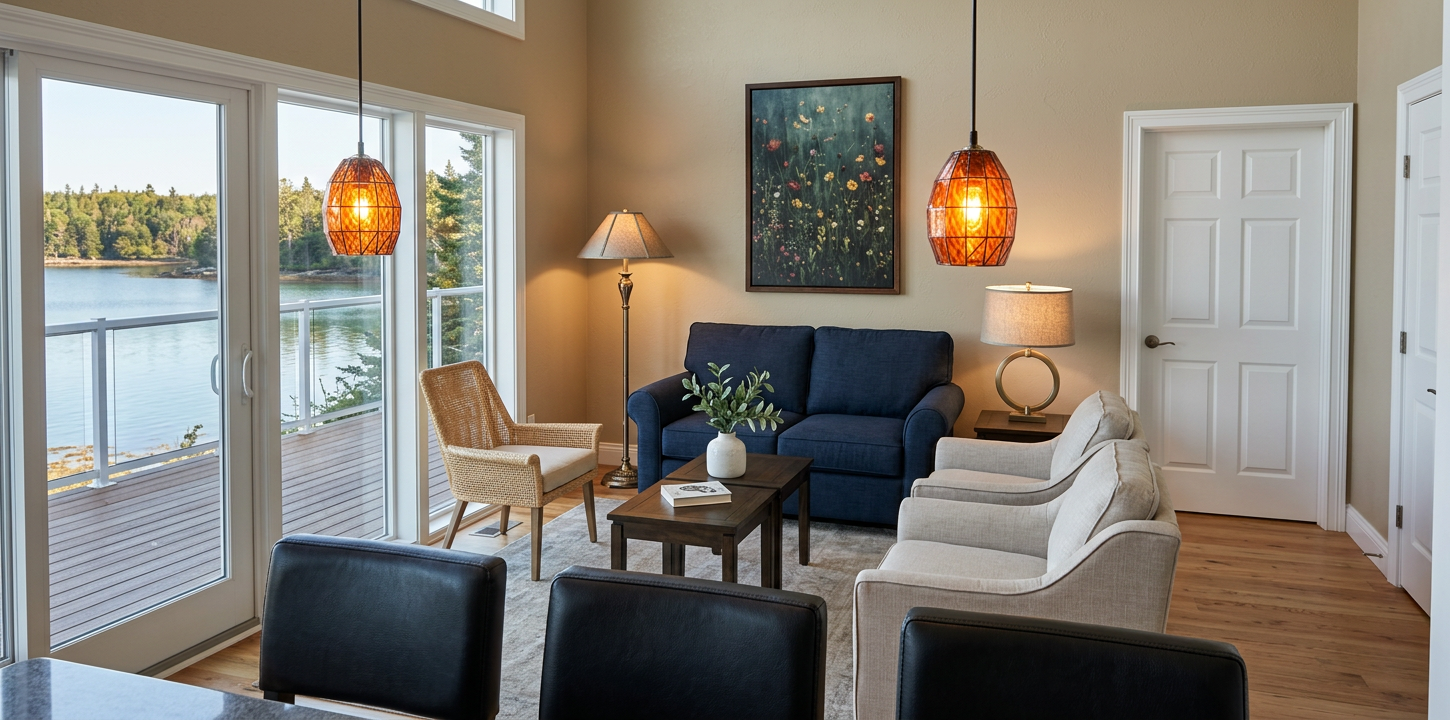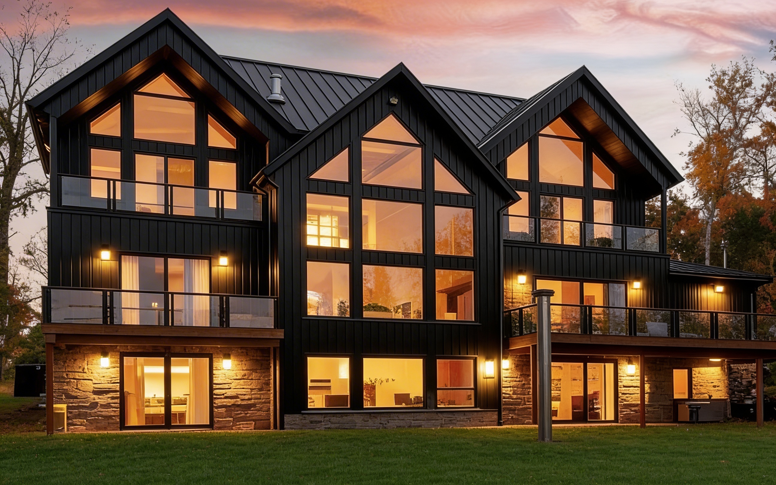 make as photorealistic as possible while keeping textures and architecture the same as selection add professional landscaping in a sparsely wooded scene with good lighting in ravenna ohio match materials to plan and remove any texts and tringle shapes on roof colors selections are as follows board and batten siding color to be nightfall 505557 horizontal siding color to be nightfall 505557 corner boards to be nightfall 505557 entry door with glass panel with grilles panels and shelf as shown to be painted white fafafa entry door will have an schlage plymouth satin nickel door knob with deadbolt above the windows window trim fascia and soffit to be white fafafa the porch posts are to be painted white fafafa and shingles to be certainted landmark dimensional multi layered shingles color black