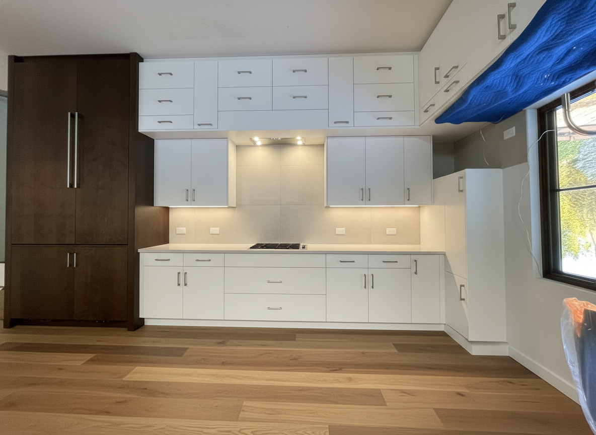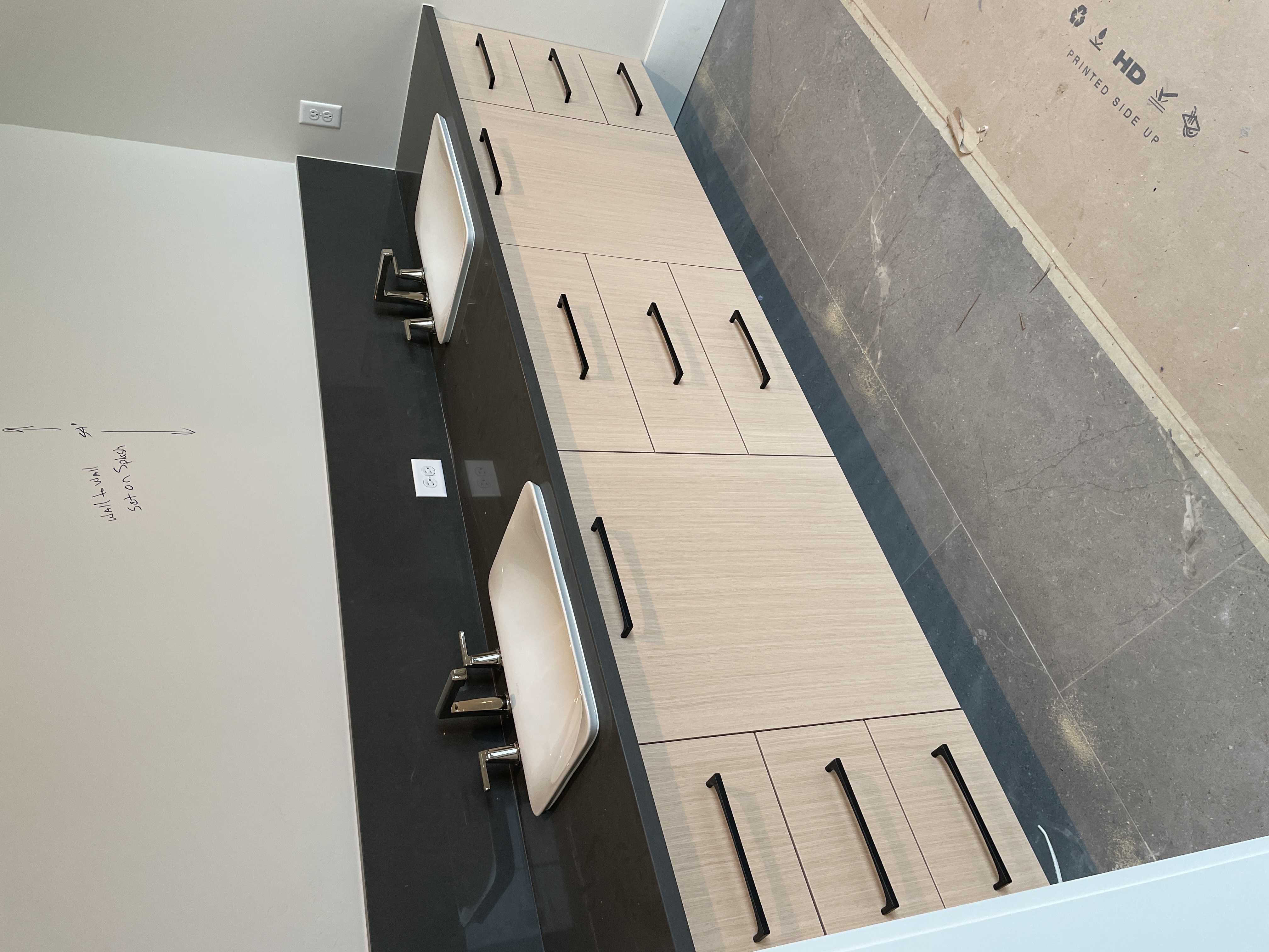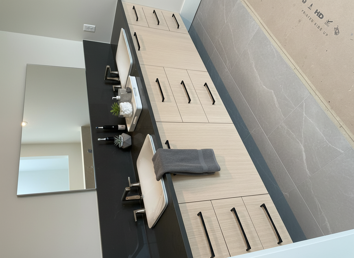add tile floor put in a full length mirror above the backsplash and stage the countertop with modern bathroom vibes