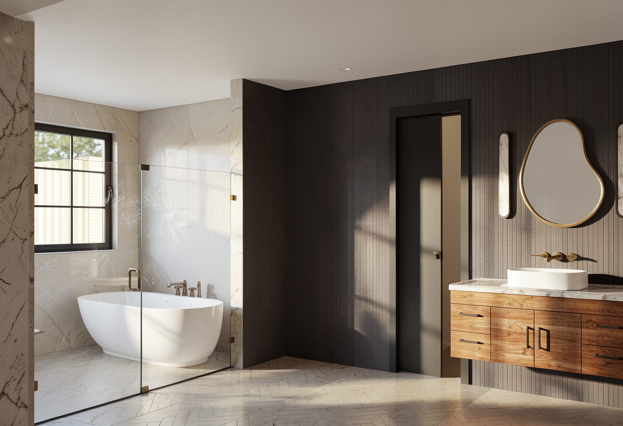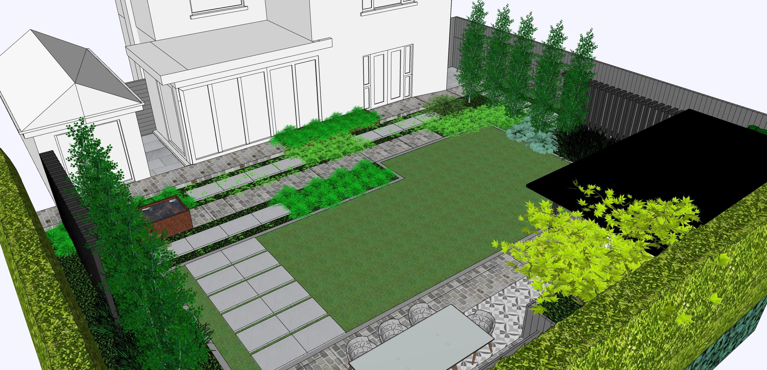 red brick house dark grey window and door frames paving setts to be sandstone sandstone paving flags as stepping stone flags through lawn and planting rusted corten steel pond grey board fence acer tree dark aluminium roof of garden room steel posts with a small overhang five tall beech trees low lush green planting around stepping stone flags japanese forest grass hostas irises etc sun coming from back of house so table area in the full sun and area around the house in the shade