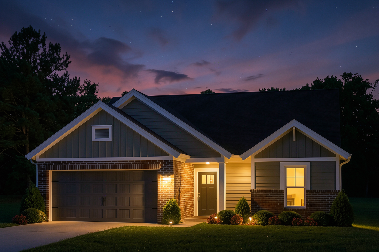 create a dusk summer night do not make the image appear too dark do not alter the exterior appearance of the home