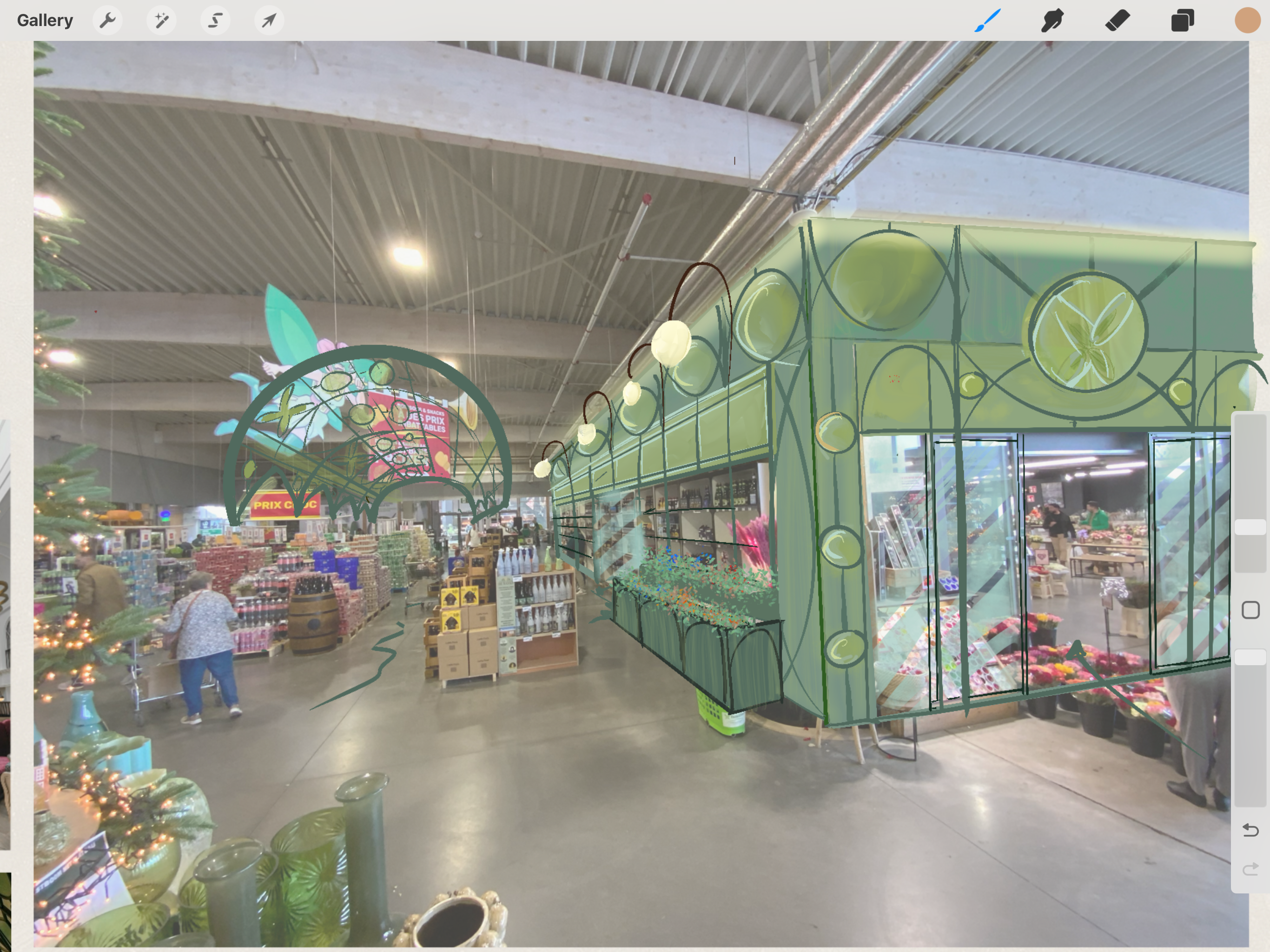 render this facade this is a decor in a gardencenter with modern green and gold tones