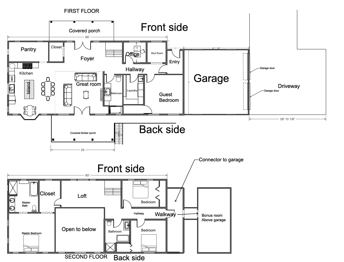 show front elevation view 60 long 2 story home with a nice central cupola standing seam roof with minimal pitch nice symmetrical front porch board and batten vinyl siding with cedar shake accents 2 car garage off left side build true to the attached layout entire home is 96 long modern farmhouse style timeless with a touch of barndominium garage doors will enter from left end bonus room accessible from main second story above garage do not show garage doors
