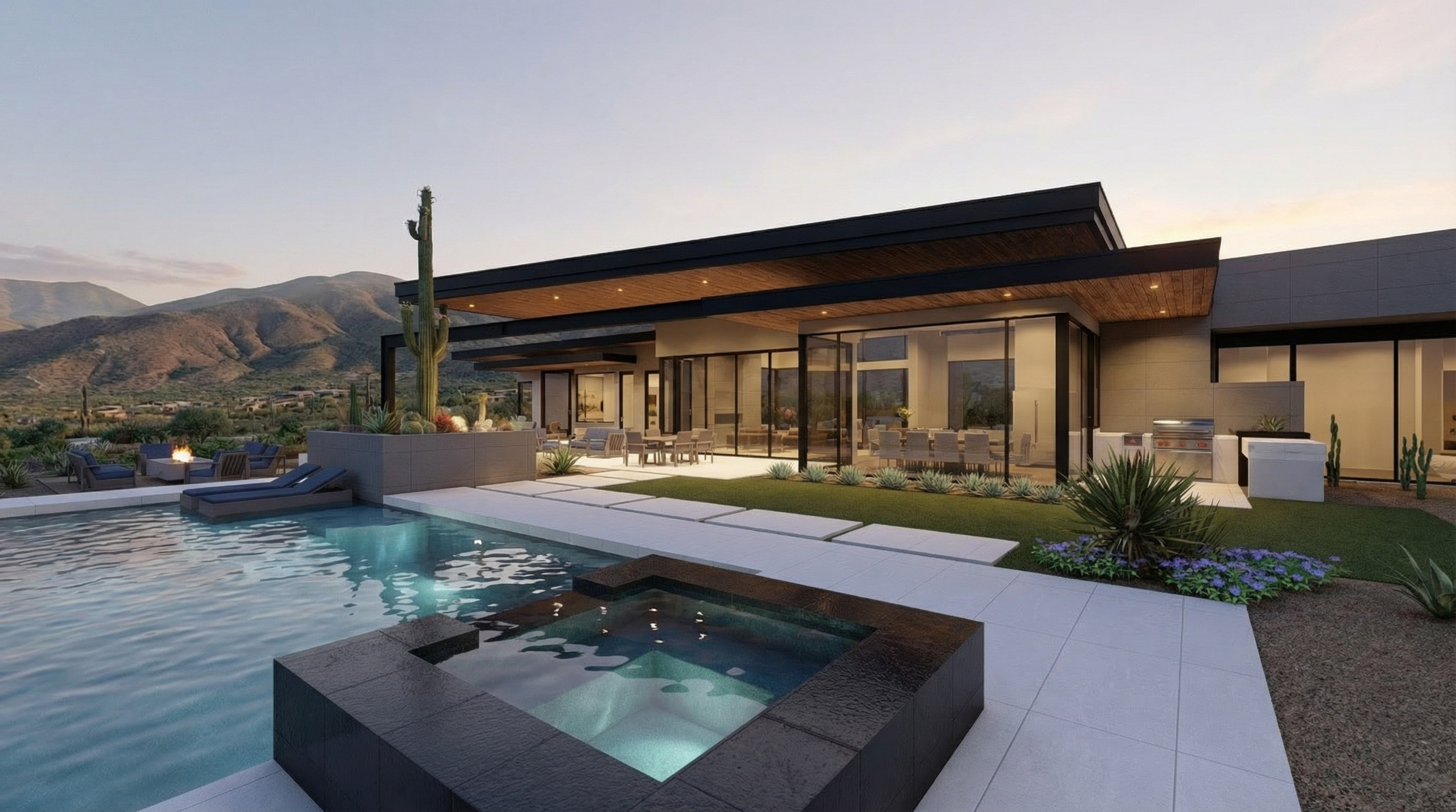 replace only the sky do not modify the house garage driveway landscaping lighting materials reflections colors or perspective keep all architecture exactly the same generate a soft natural early evening sky with a smooth gradient very light atmospheric haze near the horizon minimal cloud coverage less than 40 clouds must be distant thin and low contrast no defined cloud edges neutral color tones realistic dynamic range professional architectural photography style no cumulus clouds some large cloud formations no high contrast clouds no hdr no orange glow no purple tones no storm clouds make sky 30 more blue