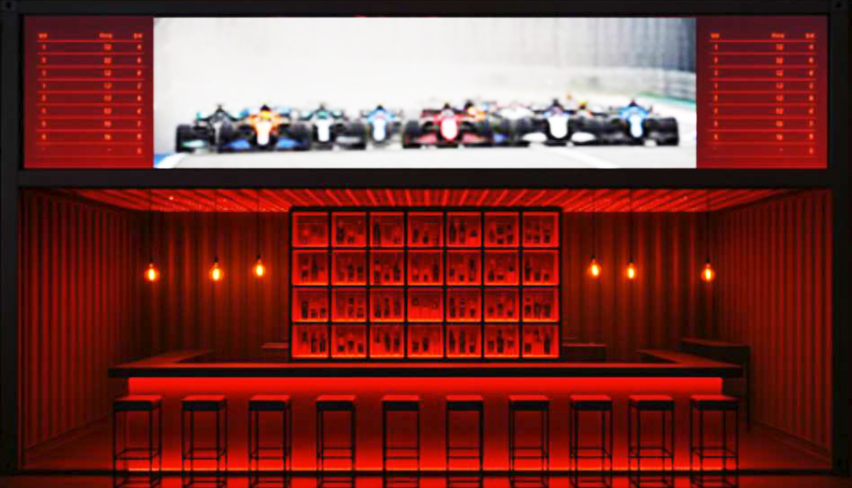 a futuristic racing car showcase center a sleek formula 1 car in vibrant red with black accents on a circular platform background in deep charcoal gray with the stage illuminated by a soft white light from a broad ceiling structure incorporate bright white signage in the rear surrounding elements include modern white and metallic gray structures with subtle red highlights set against a sophisticated ambient atmosphere add a touch of blue light wash over the background to enhance the modern tech savvy environment