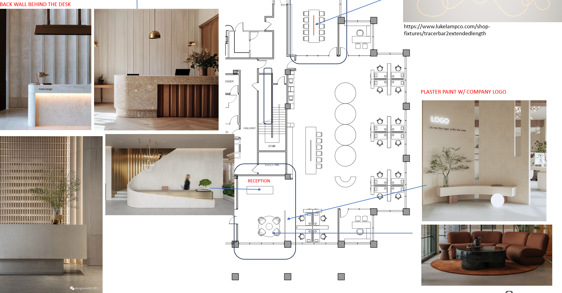 interior shot create a 3 d rendering of the plan shown above with the mood imagery that are shown next to it this is a high end office entry reception and seating area