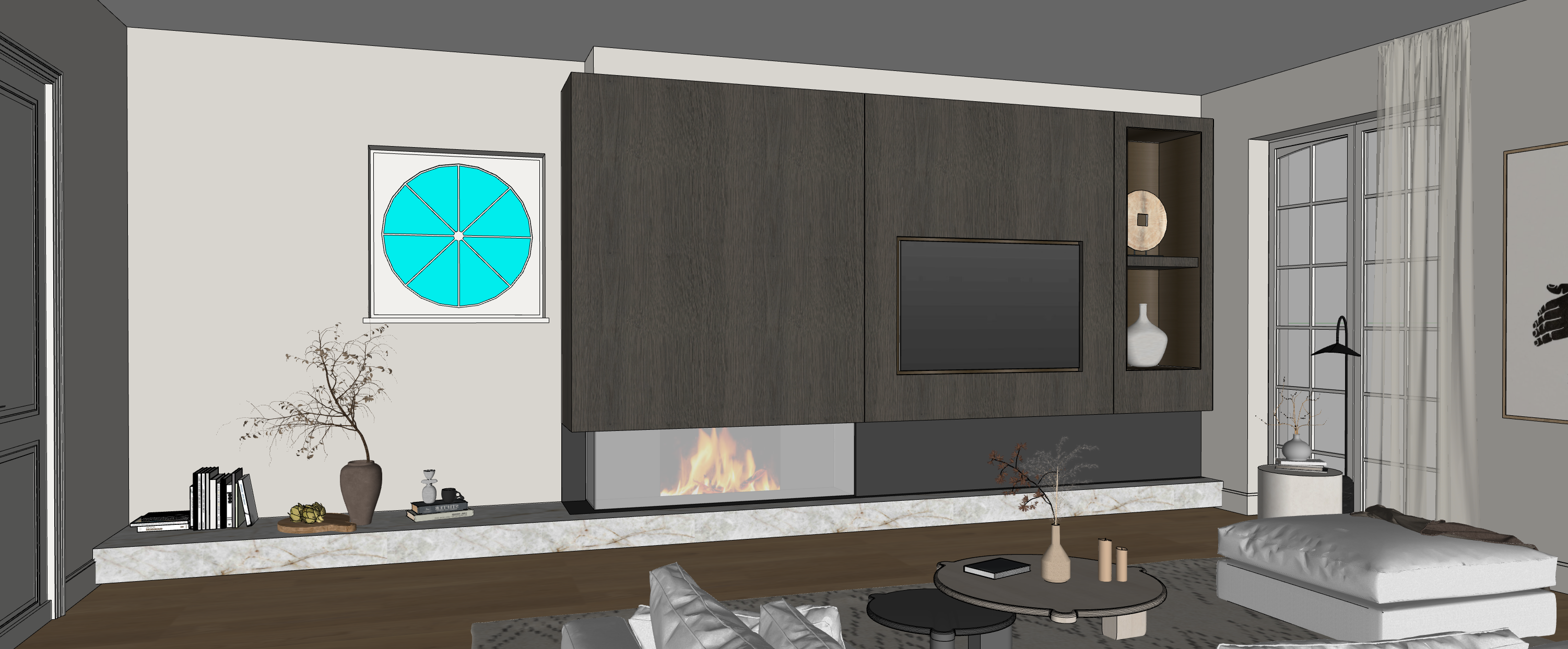 maak fotorealistisch make the blue parts of the round window appear as glass looking out to greenery