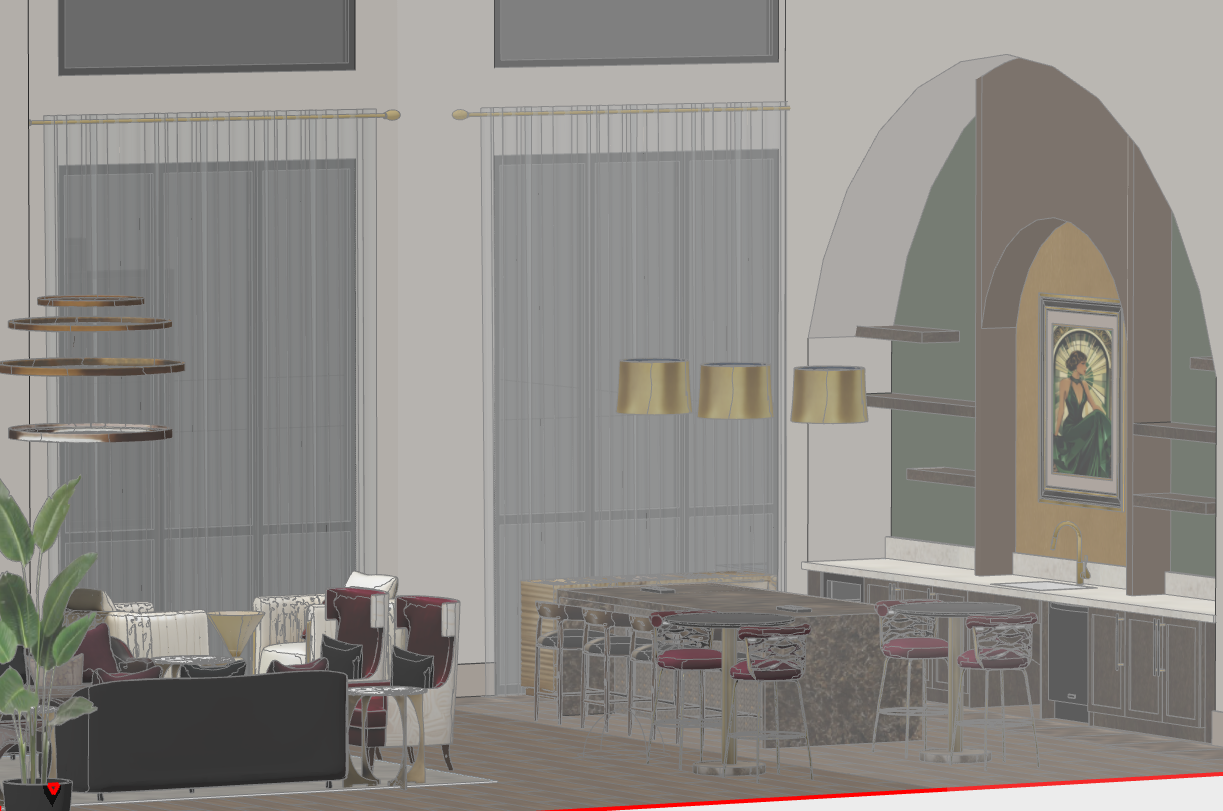 photorealistic luxury hospitality interior refine all materials and textures realistic upholstery warm wood floors polished stone and brushed brass improve natural daylight through tall windows with soft ambient lighting add realistic shadows depth and reflections clean edges no grain modern luxury restoration hardware style high end hotel lounge cinematic 4k architectural render