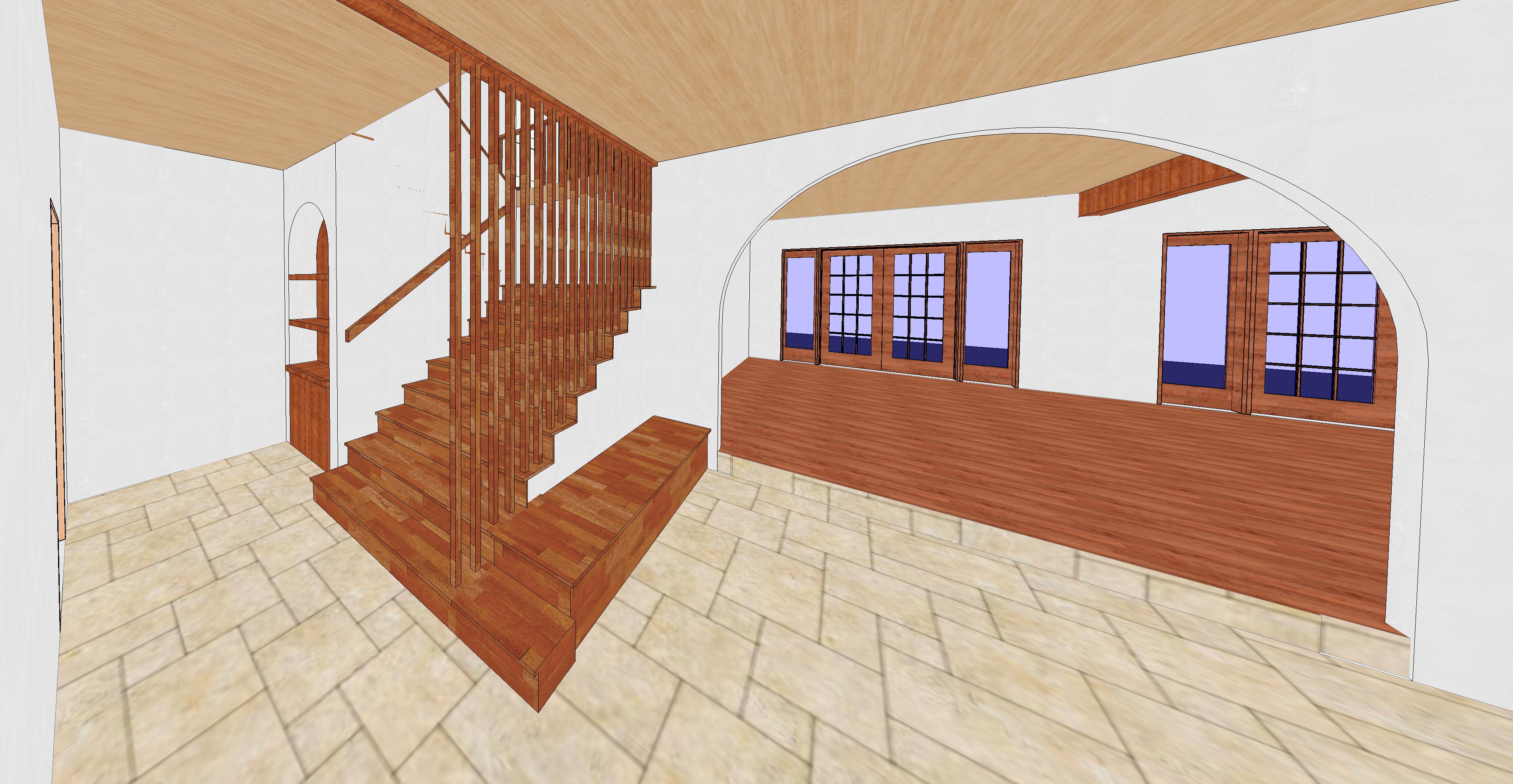 modernist interior shot a cozy sunlit interior with elegant architectural details the floor is a light beige stone tile with subtle texture the wooden staircase and ceiling beams are rich chestnut brown adding warmth walls are a soft creamy white creating an airy feel windows are large with wooden frames letting in gentle afternoon sunlight casting soft shadows an archway elegantly divides the space the atmosphere is inviting and serene perfect for a relaxed comfortable living space architecture