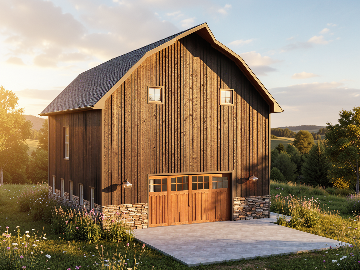 this is a traditional timber framed house it has a wrap around deck with a detached garage the lower pitched roofing is antique grey metal roofing the upper roof is grey asphalt shingles windows are dark bronze timber posts are reclaimed barn wood all exterior siding is also reclaimed barn wood