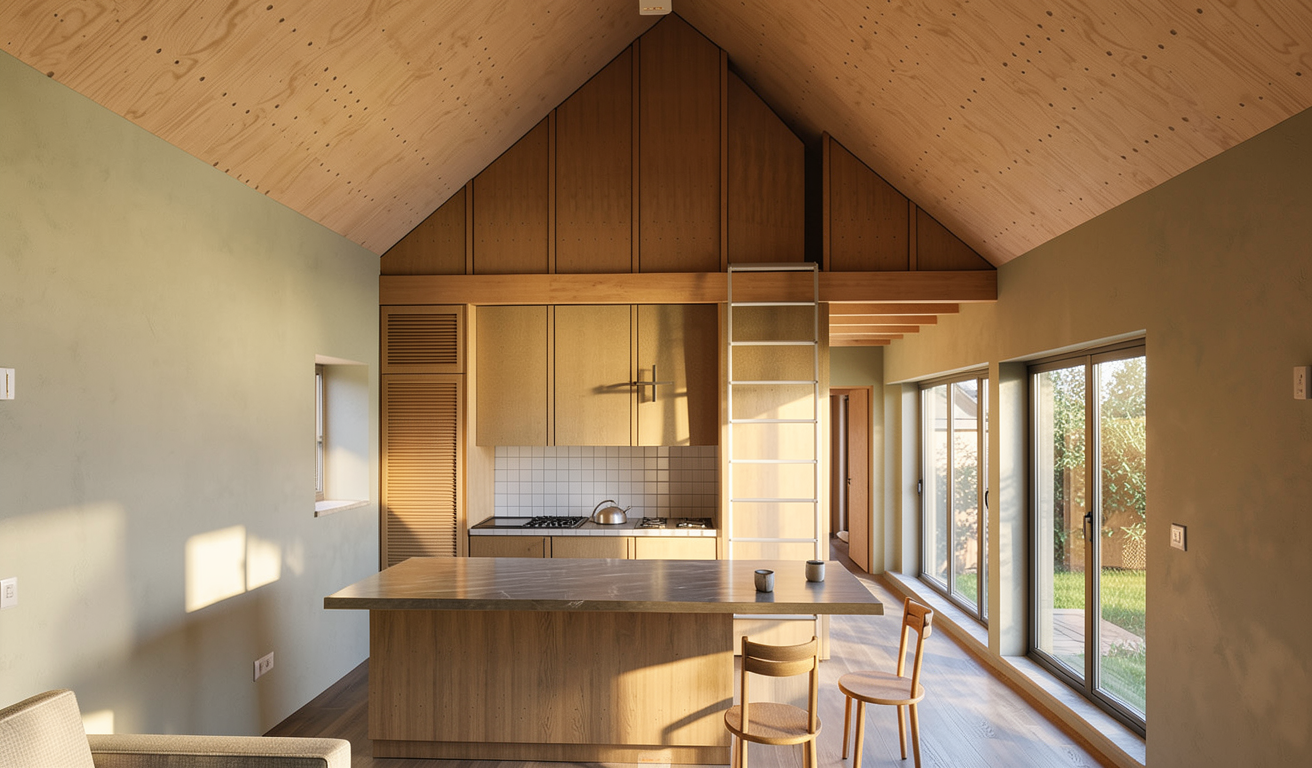 provide a photorealistic rendering keep all the elements proportions and materials as they are provide daylight through the glass only provide a grey beige leather on the sofa provide a deep green fabric on the chair add a linear light wash at the wood wall keep logo as is