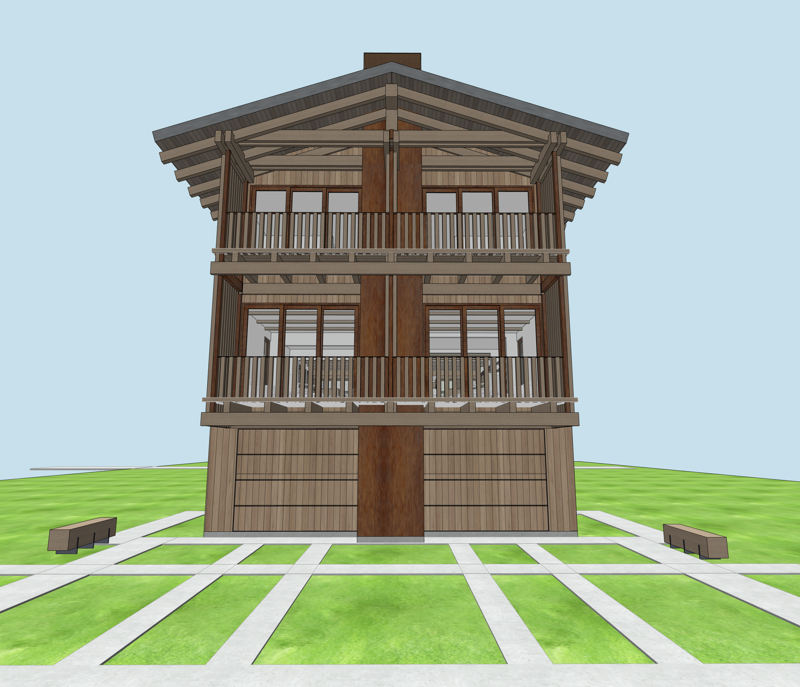 maintain dark brown rusted metal chimney lighter wood tone that resembles more of a grey yellow brown add small green bushes on either side of the building add small aspens and pine trees on either side of the building and slightly in front add basic homes that are 1 story in the style typical of the 1980 s with gable roofs that are mostly transparent next to the site add green hill behind off in the distance