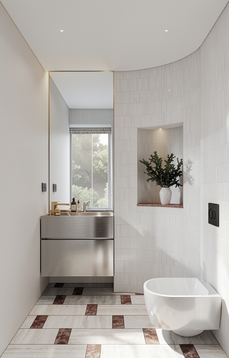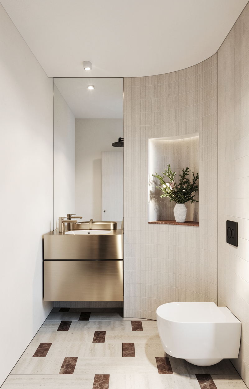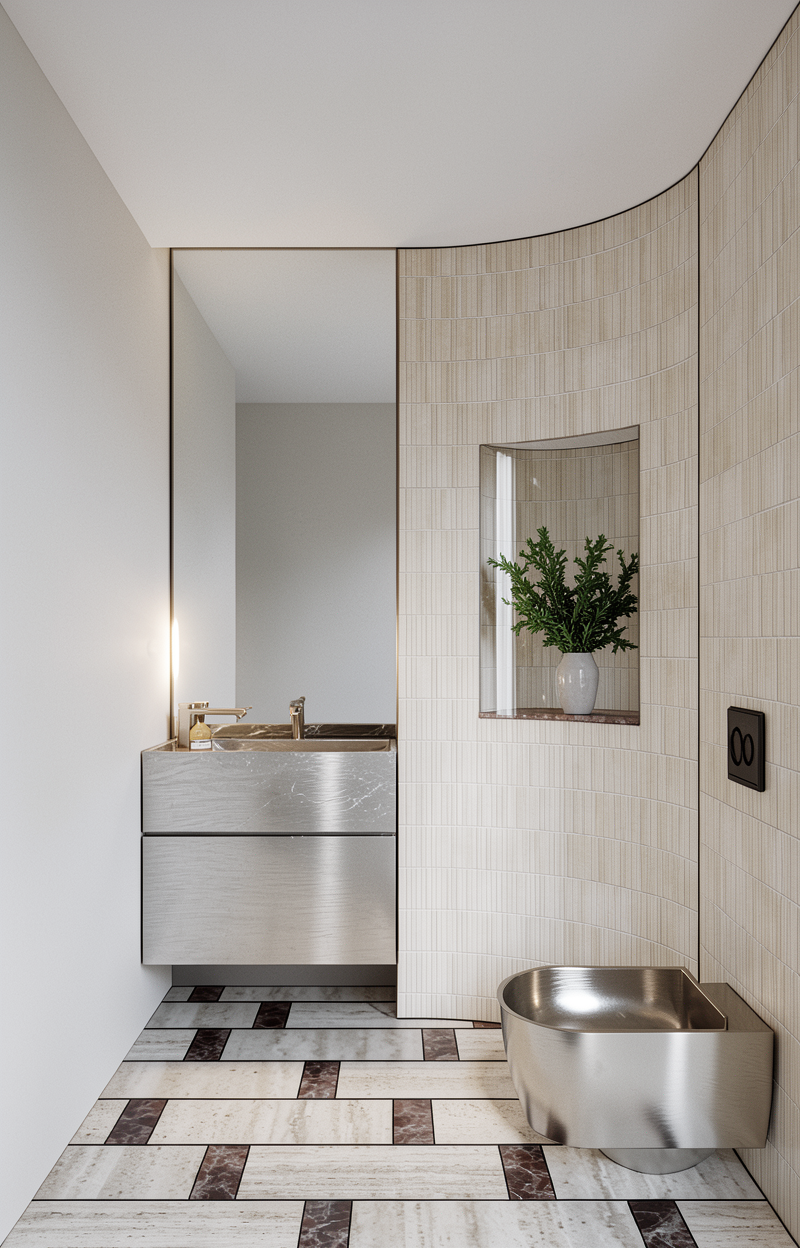 photorealistic render with polished taj mahal materal keep all the existing geometry and materials intact and true to original soft natural lighting from right side darken the ceiling slightly for sandblasted pine and slighly more yellow keep the taj mahal line as same as the model drywall is above it