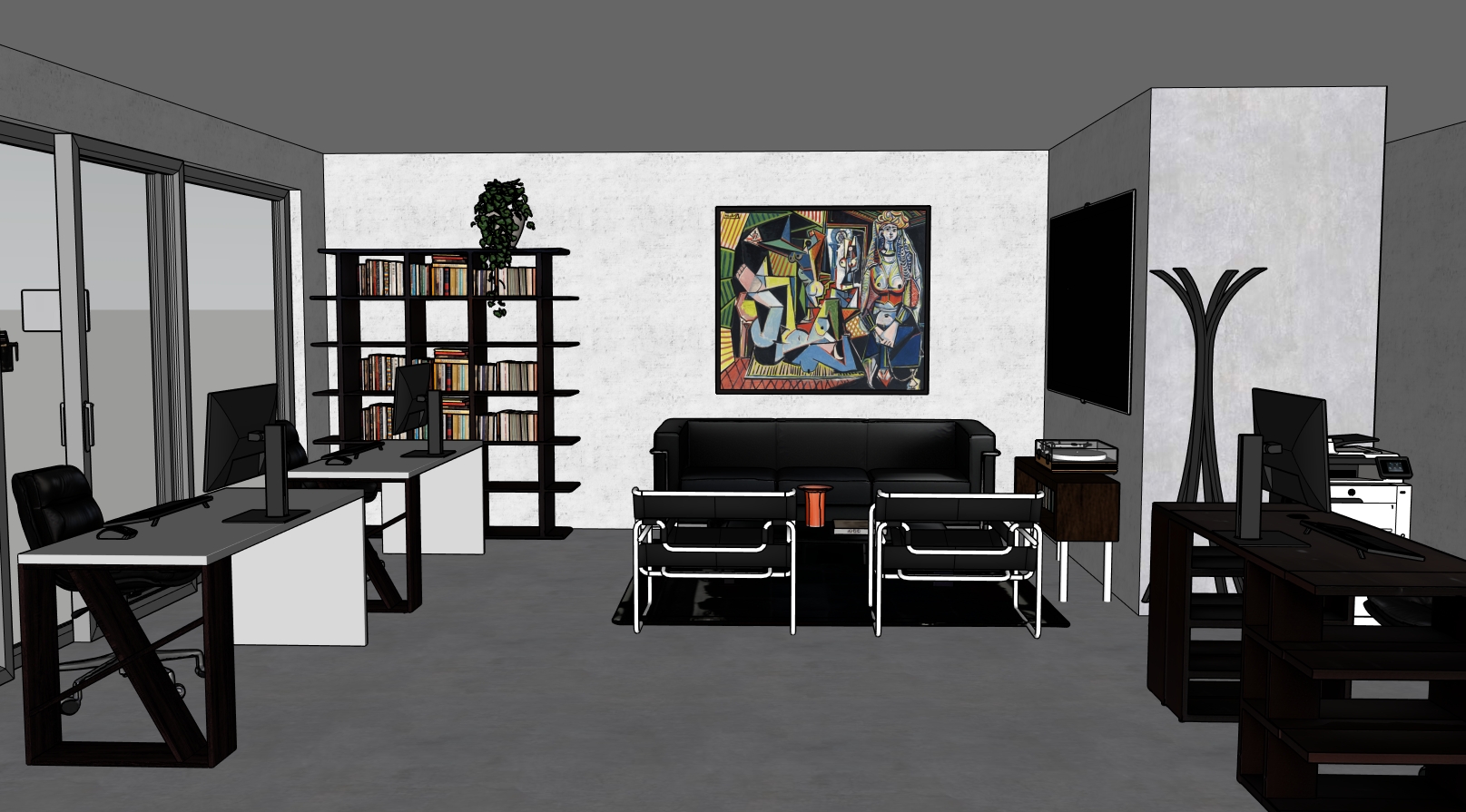the desks are inox material the chairs have inox silver legs the floor and walls are matt concrete kind of dark and raw the sofa is black leather and shiny the balcony has a city view and its daylight also put some modern mini lights on the ceilling