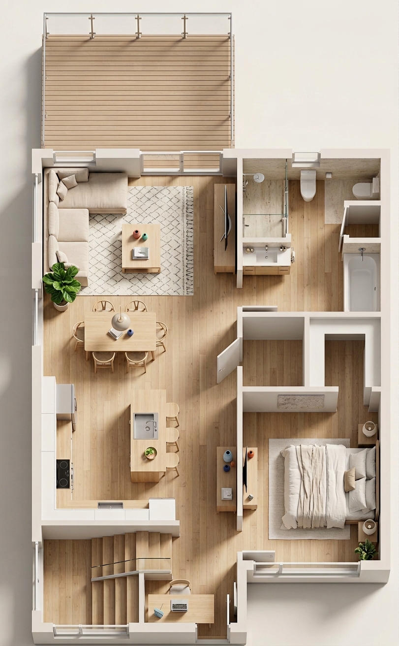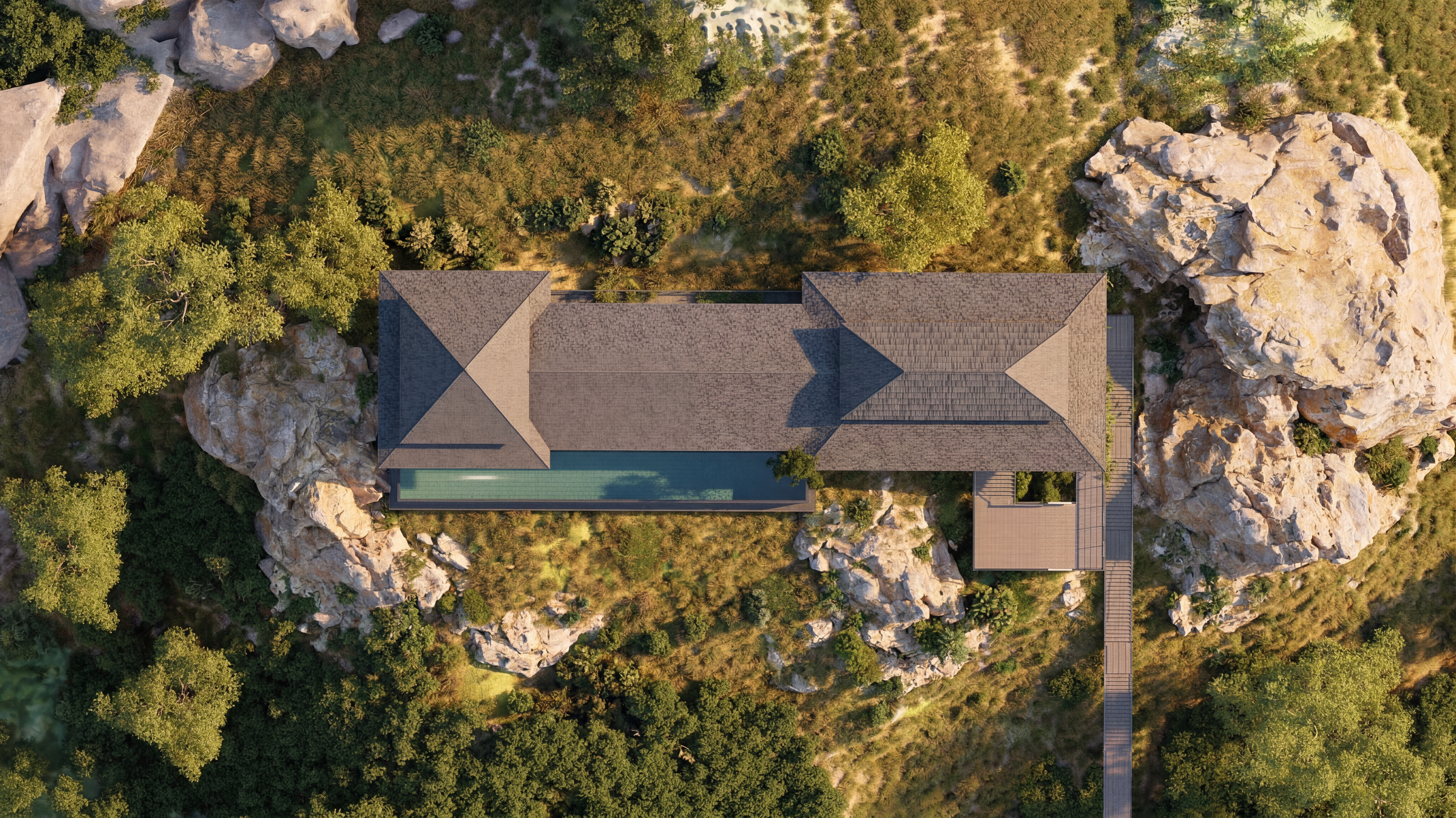 enhance the terrain environment while strictly maintaining the original building design structure materials proportions and layout do not modify the architecture roof geometry terrace arrangement or structural elements maintain the exact original top view camera angle camera height framing and perspective refine the existing terrain with minimal modification preserving the original landform and slope structure do not introduce new large terrain formations or drastically alter the landscape composition subtly enhance the terrain character to resemble natural labuan bajo hillside conditions inspired by grassy limestone ridges and layered tropical slopes while maintaining the existing terrain geometry improve terrain realism by refining surface textures using dry tropical grass scattered shrubs and small exposed stone patches blending naturally with the original ground conditions introduce very subtle limestone rock accents along natural slope transitions and near the building foundation to reinforce the impression that the structure sits naturally on rocky terrain enhance vegetation distribution using natural clustering placing slightly denser vegetation in lower slope areas and valleys while keeping upper slopes more open with grass dominant surfaces avoid adding excessive trees or forest density if visible from the top view subtly refine the distant coastline by introducing a gentle turquoise to deep blue water gradient ensuring the shoreline remains natural and not exaggerated blend all terrain transitions smoothly to maintain a soft and natural landscape continuity avoiding sharp edges or artificial looking terrain modifications enhance lighting and shadow definition to improve terrain readability from the top view while preserving the natural brightness and original environmental mood maintain full architectural integrity and original composition while enhancing terrain realism with minimal visible change camera settings original top view camera preserved aerial clarity maintained subtle terrain contrast enhancement photorealistic output