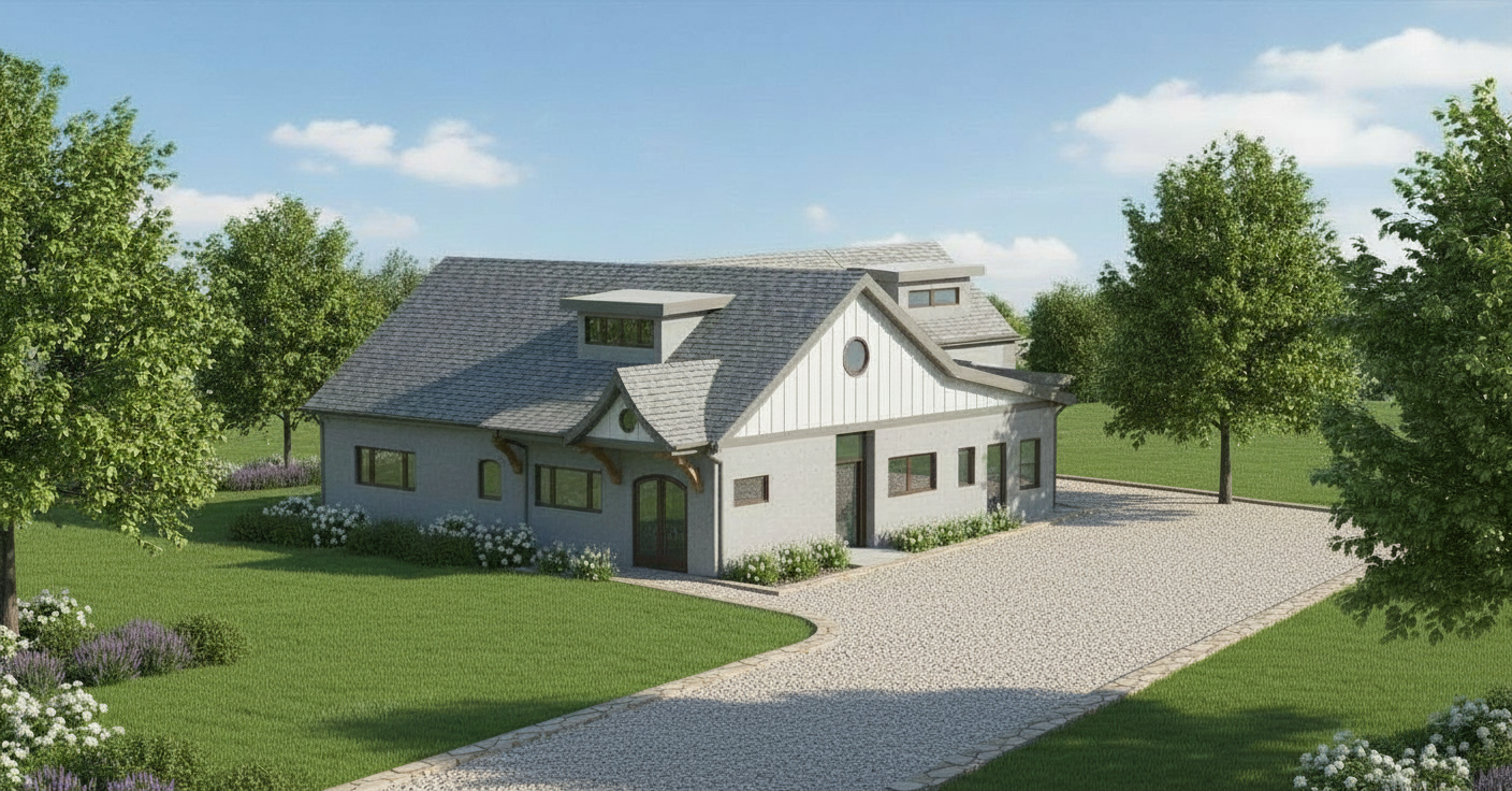 add a two car garage on left far side of home with roof ridge from side to side push the garage back from the front of the home show both garage doors beyond the left side of home