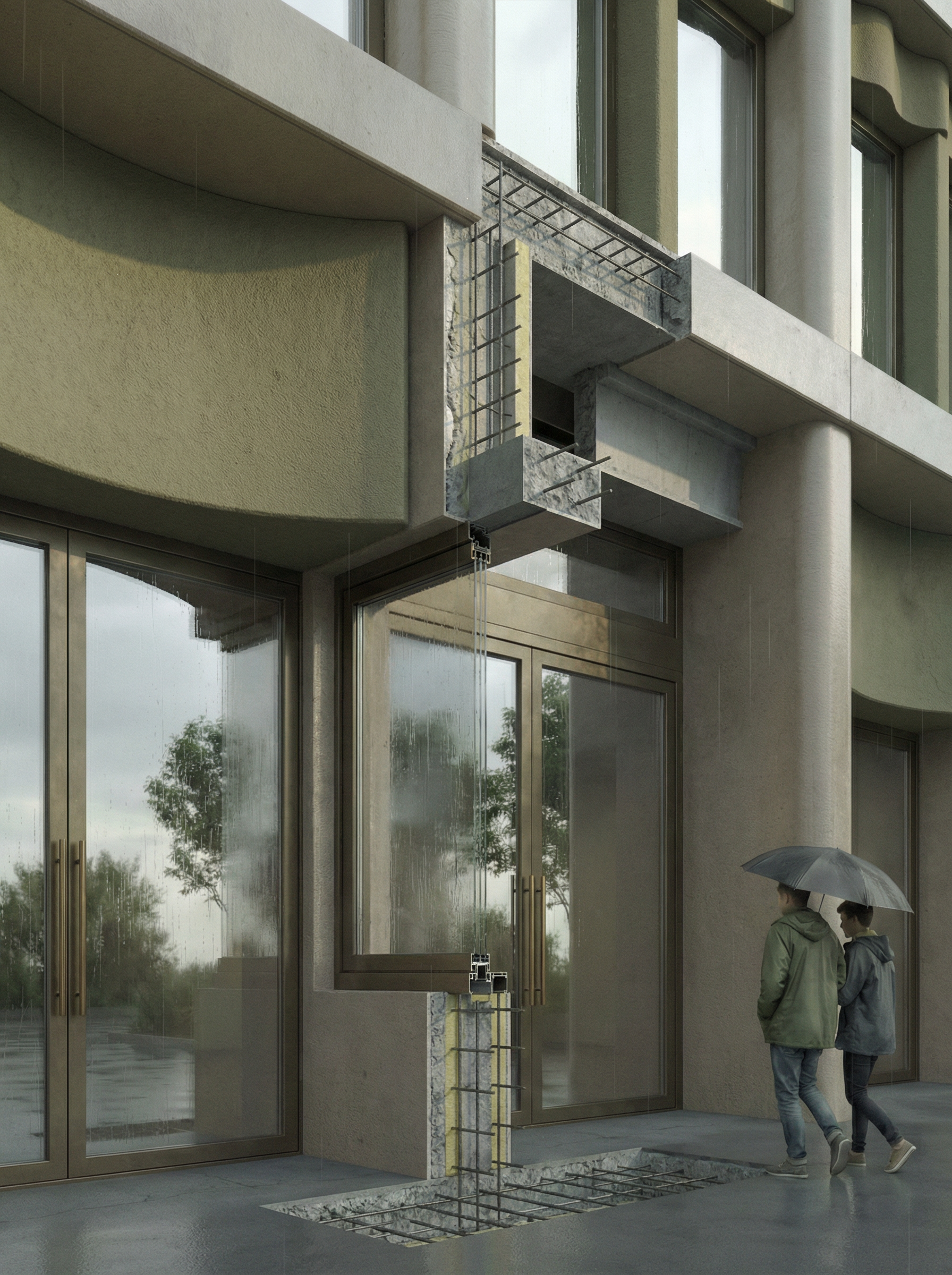 create a cropped 3d perspective cutaway section of the fa ade reference