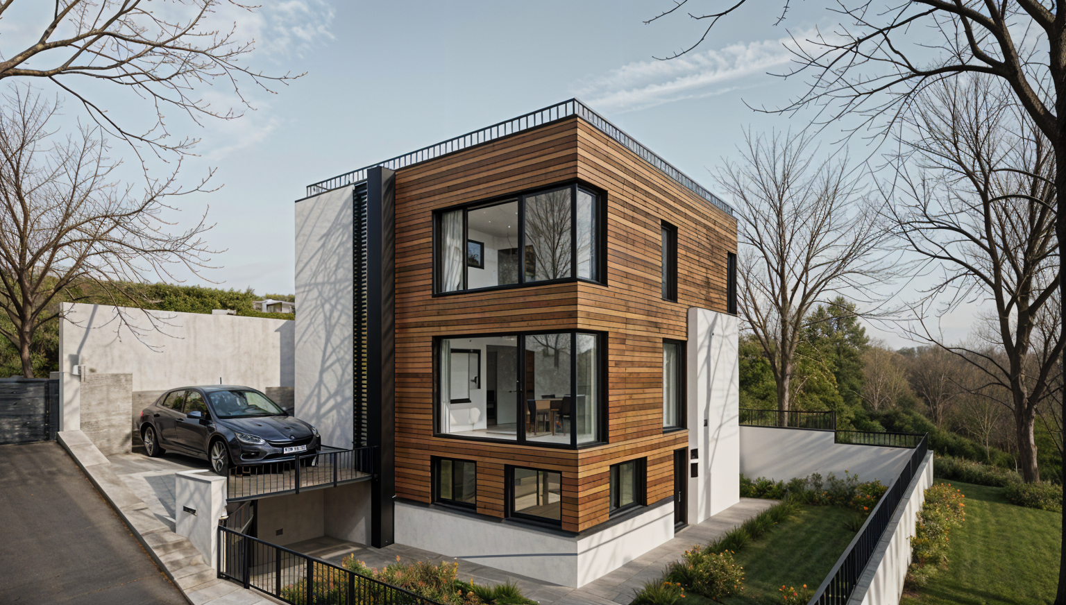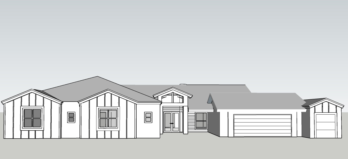 modern farmhouse with a dark concrete flat tile roof white walls with vertical siding dark window frames florida palm trees modern 4 x4 concrete driveway pavers with thin turf joints beautiful lush landscaping replace the window on the right with a golf cart garage door and driveway access both garage doors dark add light sconces at both sides of each garage door and large windows