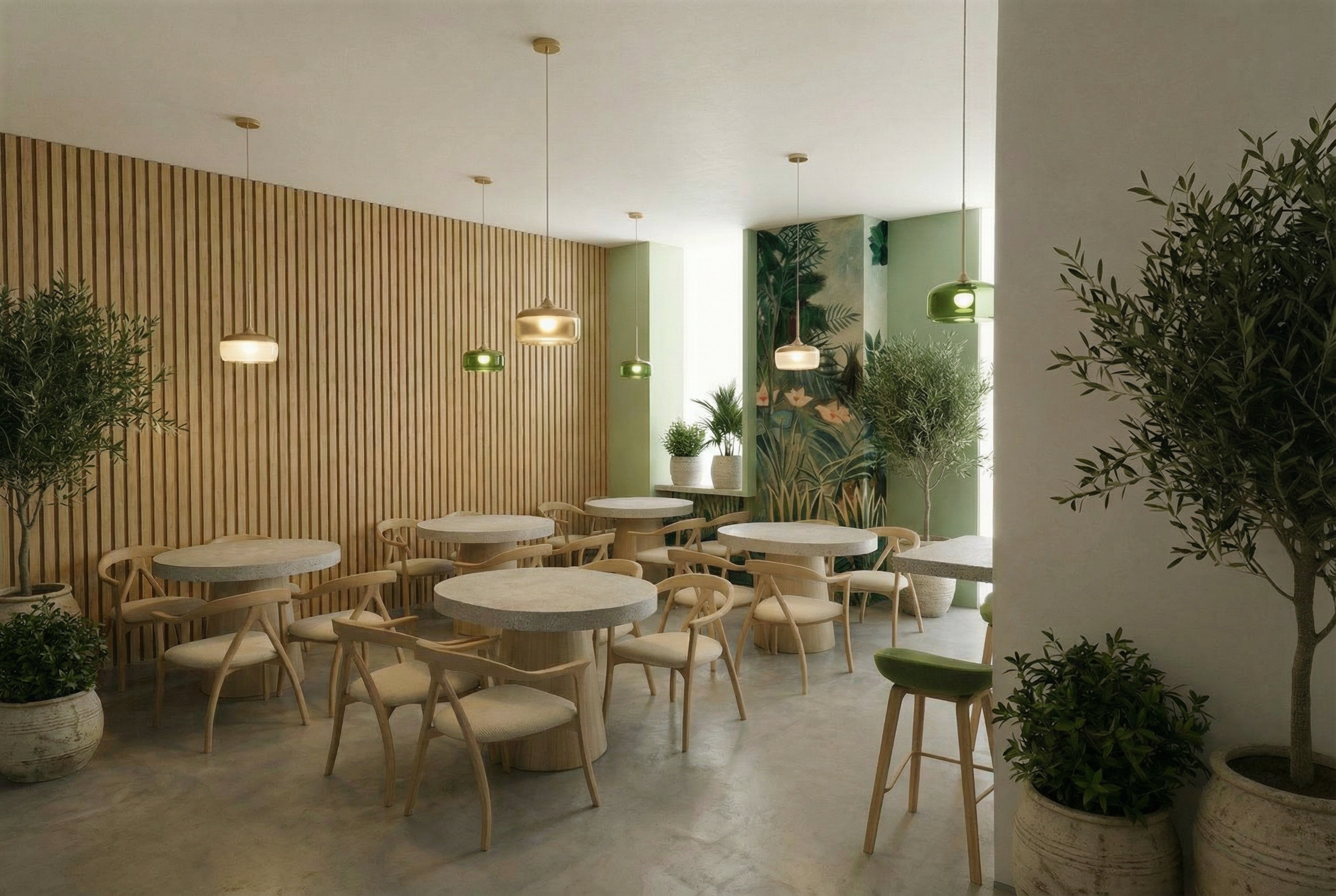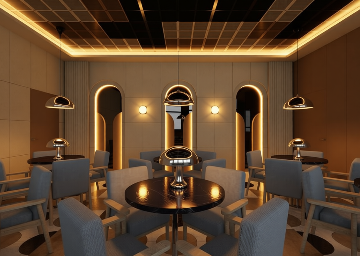 transform this restaurant interior rendering while strictly preserving the existing architecture layout and composition preserve exactly the geometry position proportion scale size materials colors textures and function of all existing elements do not move resize redesign or remove any walls niches arches ceiling elements wall panels tables chairs or decorative objects maintain the original camera perspective and spatial composition the vertical wall panels located between the niches must remain completely unchanged do not modify their geometry material color texture ornament pattern or surface articulation in any way enhance the rendering quality so the image looks like a high end professional architectural visualization improve texture clarity material richness surface depth reflections and micro detail while preserving the original materials and colors create a stronger warm atmospheric lighting environment appropriate for an elegant restaurant interior the lighting should create a visible warm glow subtle reflections on materials and enhanced spatial depth lighting additions add concealed warm lighting inside each wall niche so the interior surfaces of the arches are softly illuminated the light source must remain completely hidden within the existing niche geometry add concealed warm lighting that follows the exact existing contour of the ceiling perimeter the lighting must be integrated invisibly within the current ceiling geometry and must not introduce any new architectural elements such as coves recesses moldings or ledges the effect should produce a subtle warm halo outlining the ceiling add one wall lamp centered between the left niche and the center niche add one wall lamp centered between the right niche and the center niche place one table lamp at the exact center of every table add one pendant ceiling lamp above every table vertically aligned with the center of the table and clearly visible as a suspended lighting element light fixture design the table lamps must match the design of the chrome mushroom lamp shown in the reference link exactly a polished chrome lamp with a smooth hemispherical dome shade and rounded base forming a mushroom like silhouette the surface must be highly reflective chrome and the form must be minimal sculptural and space age the wall lamps and pendant lamps must clearly resemble the same chrome mushroom lamp design language they should use the same hemispherical chrome dome form and smooth sculptural geometry adapted for wall mounted and suspended pendant versions while maintaining the same retro futuristic space age aesthetic lighting quality all fixtures emit warm light that creates a visible atmospheric glow and soft reflections on surrounding materials the lighting should stand out visually while remaining elegant and balanced producing a refined evening restaurant ambiance restrictions do not add spotlights do not add track lighting do not add visible led strips do not alter the architecture or furniture layout do not modify the wall panels between the niches do not introduce new architectural elements the final image must look identical to the original interior in architecture and layout but with enhanced textures professional rendering quality and a stronger warm atmosphere created by concealed lighting and chrome mushroom style light fixtures