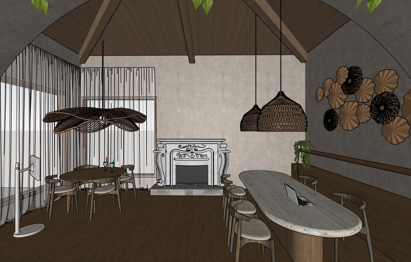 its a cozy work place it has wood floors and the ceiling has wood beams and wood paneling its inspired in a thailand resort add some decor on the shelf and iluminate the ceiling