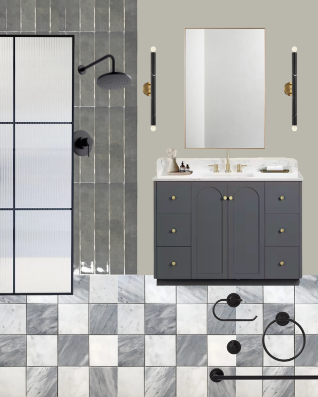 single vanity bathroom flushed to the right wall the white toilet to the left of the vanity the shower on the opposite side of the vanity make it look like its in an actual bathroom and make it look like a sketch drawing