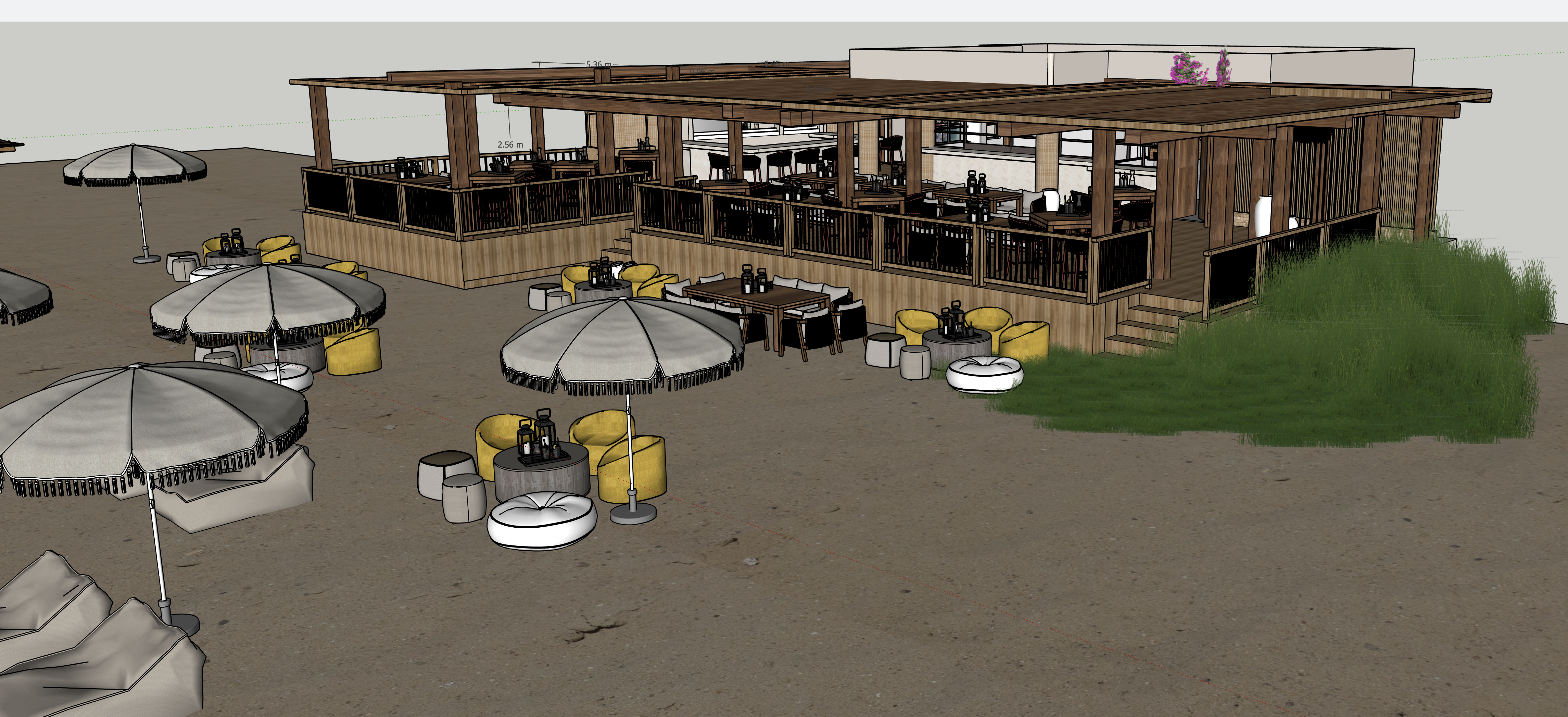beach club restaurant in sunset with indirect light in the bar at the background and spot light from the floor lighting the columns indirect strip light all around the deck light olive taupe upholstery