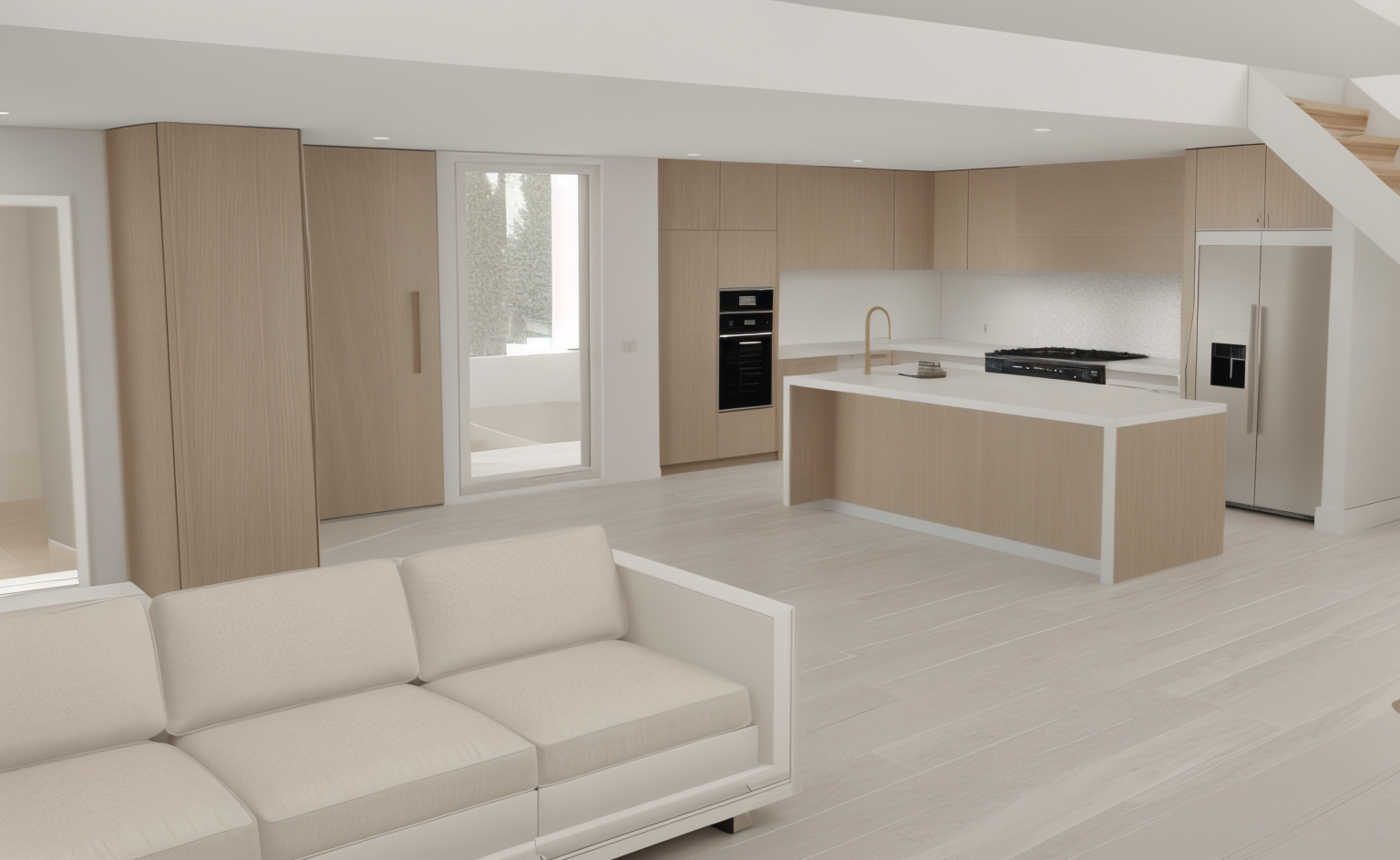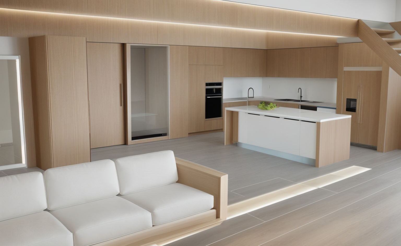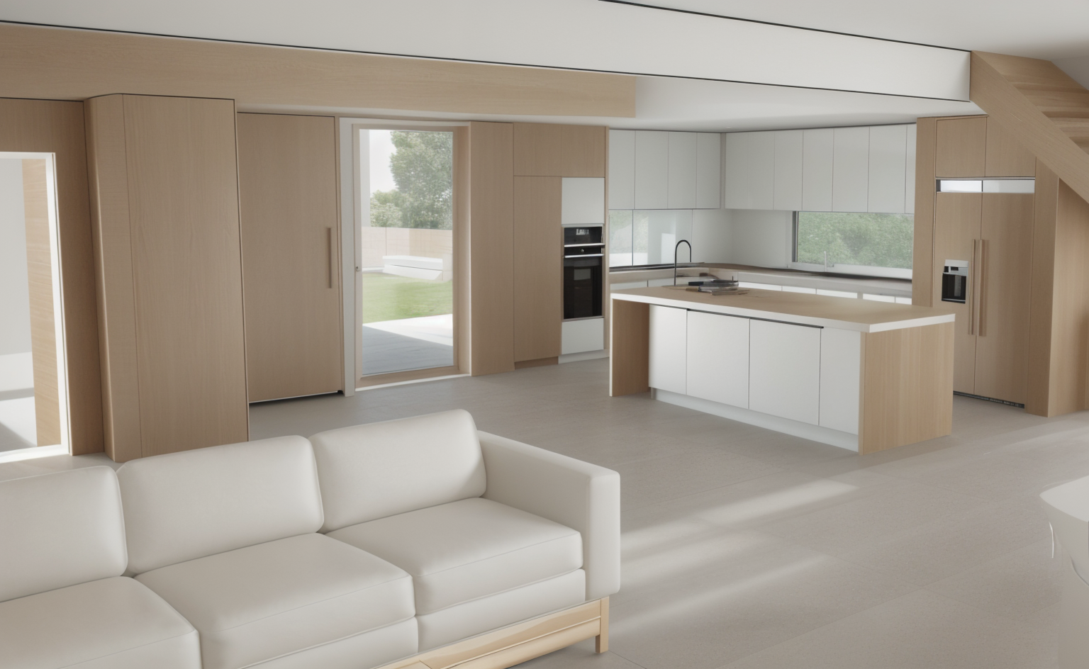 timber floors throughout space shelving in the garage near the car filled with camping gear all light fixtures are turned on tvs are on the stock market channel glass textures are accurate show realistic reflections and transparency acoustic panels on the centre and right ceilings retain joinery as drawn but add natural looking japanese inspired tile show japanese garden outside window show realistic high end furniture concrete wall in garage and car area plaster walls in remaining areas