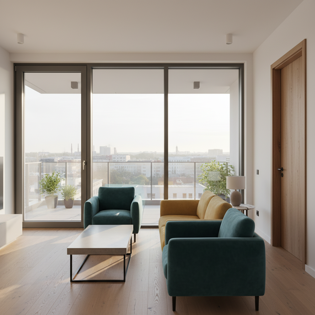 create a highly realistic render of a warm and minimal living space in a coastal home with a calm and serene atmosphere the design is inspired by seaside living combining natural materials soft tones and a relaxed yet refined aesthetic the main feature is a tv wall composed of vertical light oak wood panels creating a clean and architectural backdrop that adds warmth and natural texture a wall mounted flat screen tv is centered on the panel below the tv there is a low built in bench in the same wood finish extending horizontally and blending seamlessly with the wall composition on both sides of the central panel the wall is finished in light beige microcement maintaining a soft and sandy tone palette inspired by coastal environments there are two windows with roman shades in natural linen fabric in soft beige tones the fabric gently diffuses the daylight enhancing the airy and relaxed feeling of a seaside home natural light enters through the windows creating soft elongated shadows across the floor reinforcing the sense of calm and openness on the left side part of the kitchen island is visible along with bar stools featuring light oak wooden legs and light beige linen upholstery maintaining material continuity throughout the space on the right side full height curtains in off white linen fabric add softness and movement enhancing the breezy coastal character the flooring is in a light natural stone tone contributing to the overall serene and cohesive atmosphere the overall lighting is soft natural and diffused creating a warm inviting and elegant coastal ambiance ultra realistic render high resolution premium materials coastal interior design interior design magazine photography style very light tone oak with travertino