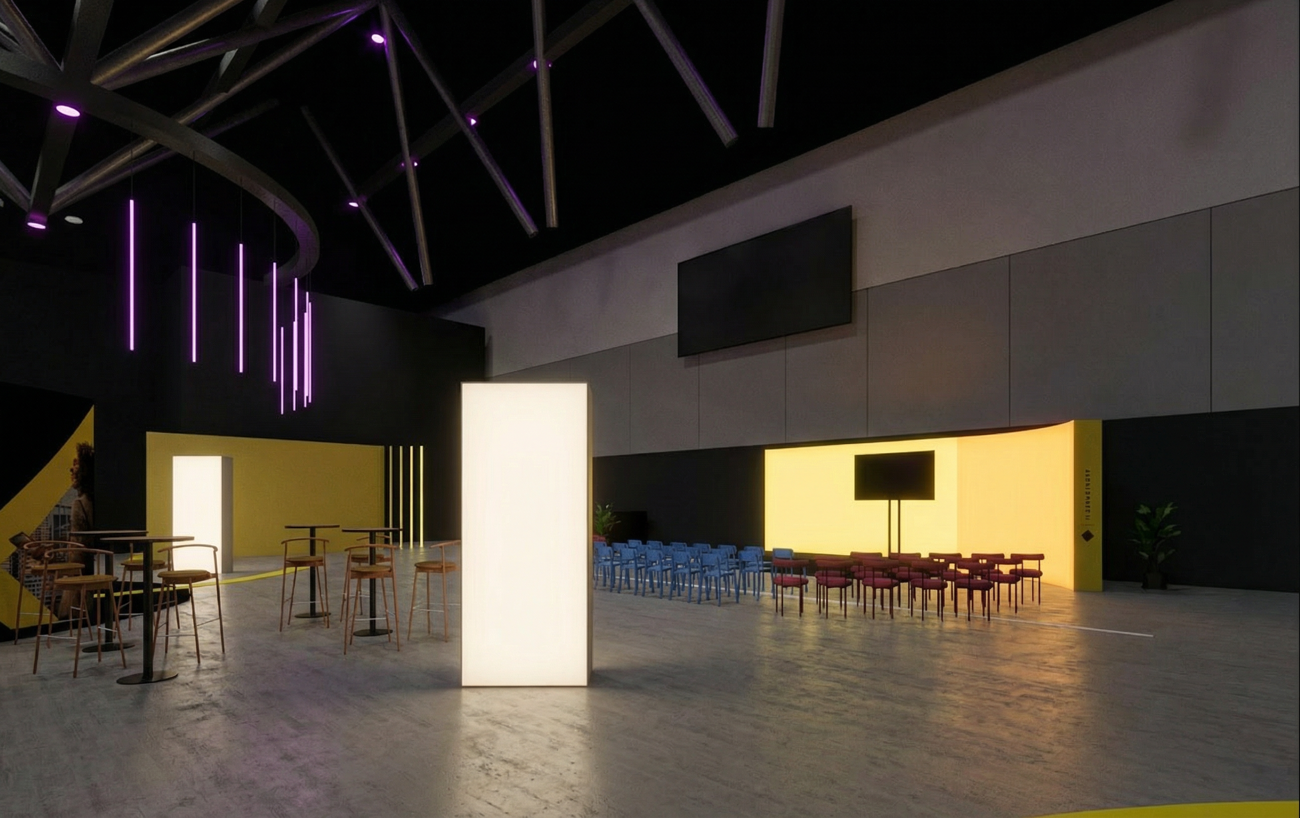 design a floorplan of a nice cafe space that has incidental interactions design with the columns in the gird dont ignore them