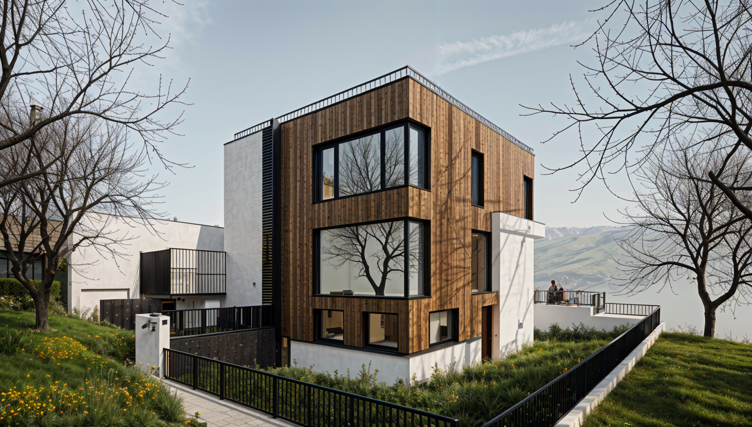 modernist exterior shot a beautifully rendered modern minimalist house set amidst a serene natural environment the house features angular wooden structures with a dark gray and black exterior large glass windows reflect the subtle hues of the surrounding landscape the wooden siding has warm earthy tones like soft browns and is combined with sleek contemporary black trimming the atmosphere is tranquil and the lighting is soft mimicking a gentle morning or late afternoon light the ground is adorned with patches of green moss and vivid yellow wildflowers adding a burst of color and life the surrounding trees are leafless drawn with delicate thin black lines indicating the late autumn season shadows of the trees create an intricate pattern on the house and the ground in varying shades of gray and brown the entire setting feels both modern and natural embracing simplicity and elegance architecture white facade keep windows from concept wood faccade to ground floor left side is slope road for cars put te car