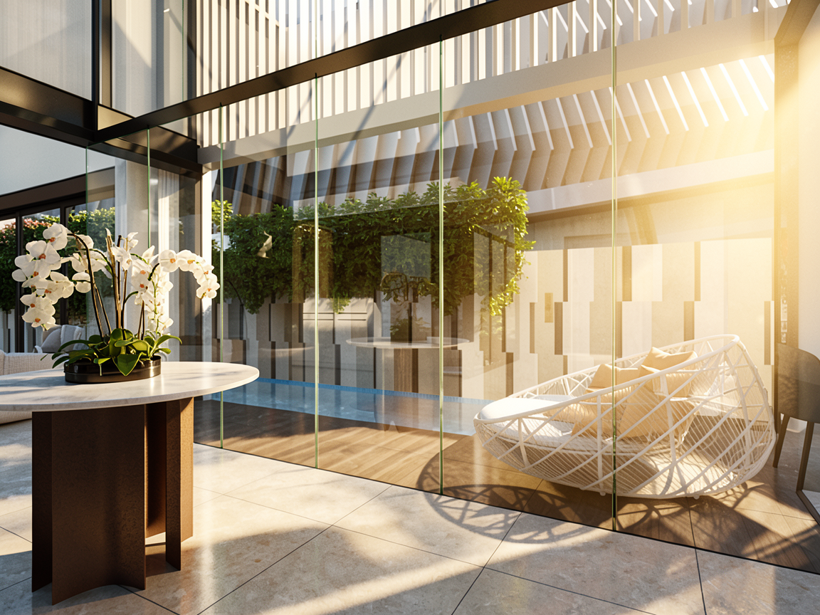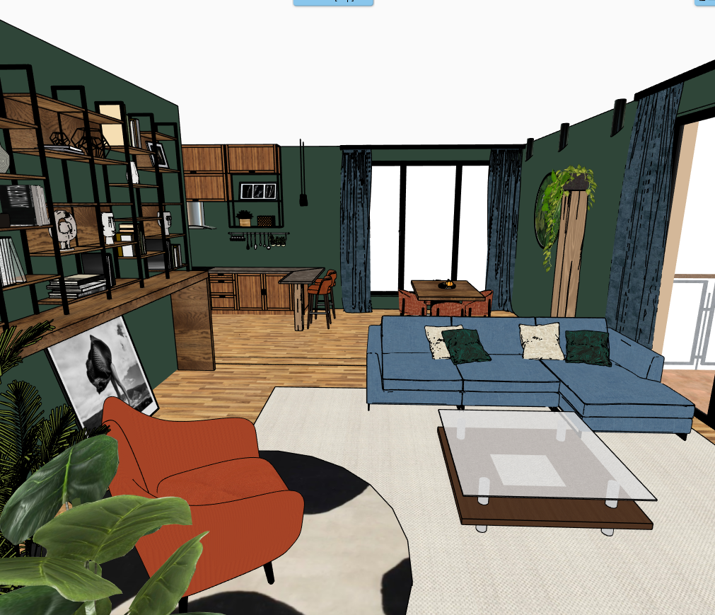 create a soft loft atmosphere the wall is dark green ral6005 the parquet is oak colored striped the sofa is blue in front of it is a thin beige structured carpet the armchair dining chair and bar stools are also terracotta colored under the armchair is a black and white circular rug the shelves are walnut colored with books vases and small statues on the shelves the curtains are dark blue with a slight pattern we can see the city through the windows the kitchen is also darker brown wood with a grayish brown marble countertop the black tube spot lights beautifully shine on the wall