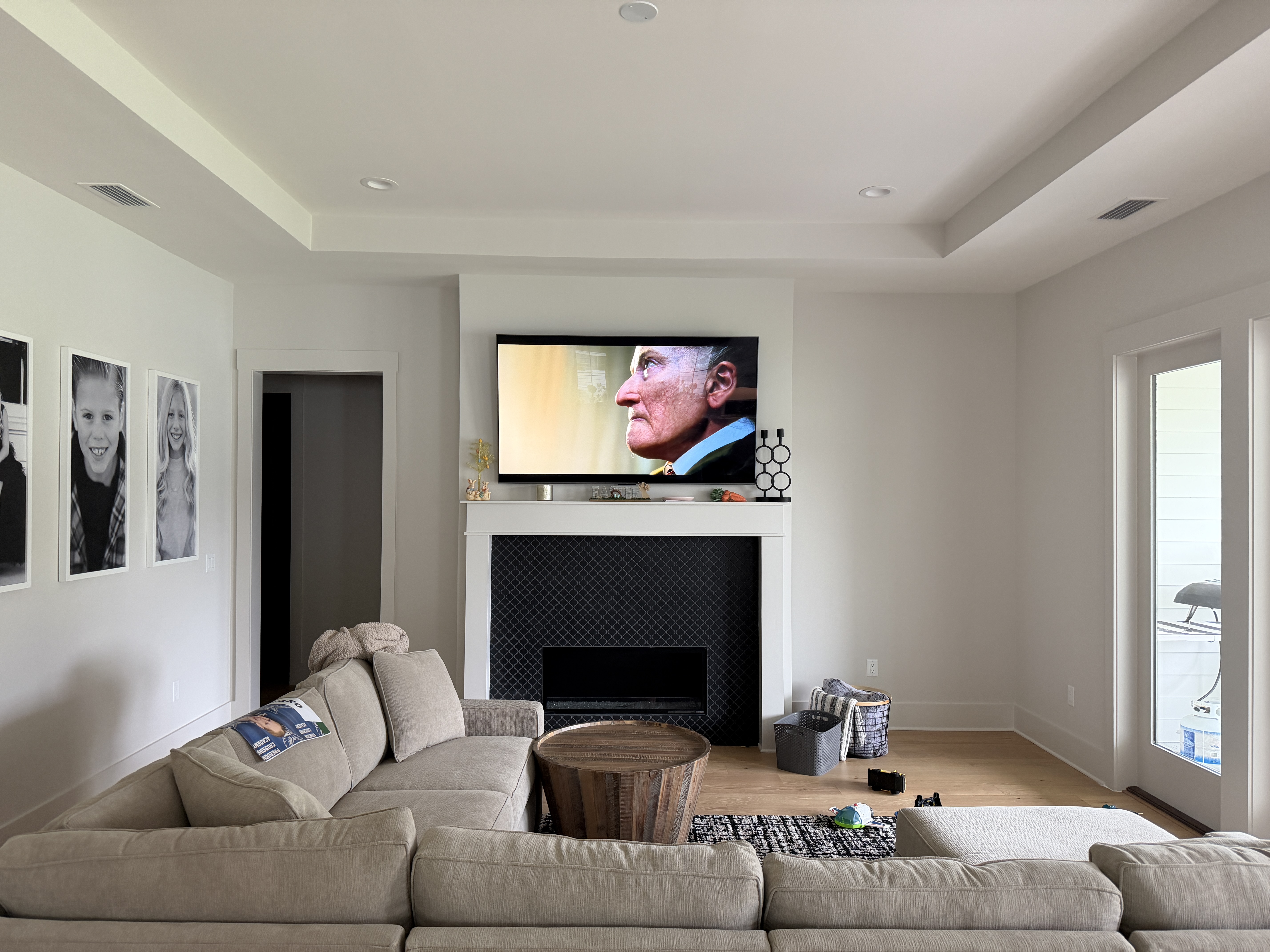 white fluted walls with some white oak around the tray ceiling modern