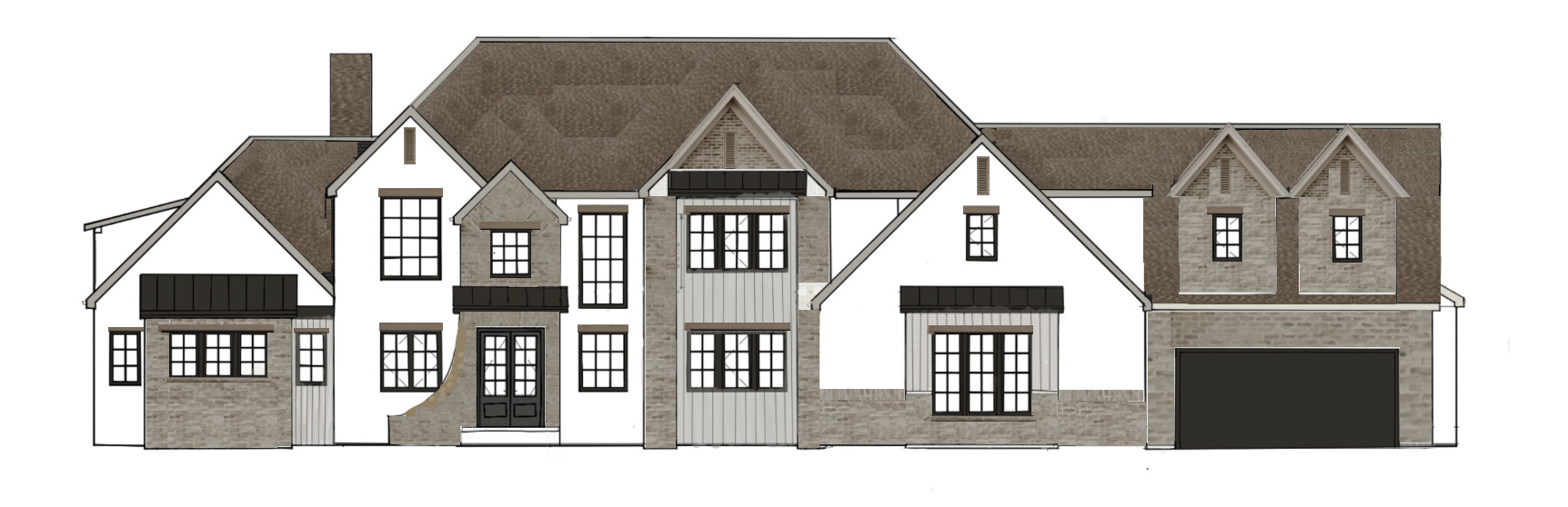 can you turn this rendering into a realistic photographic home with sun behind the brick is whitewashed stucco is creamy white roof is a brown vertical shiplap is a beige