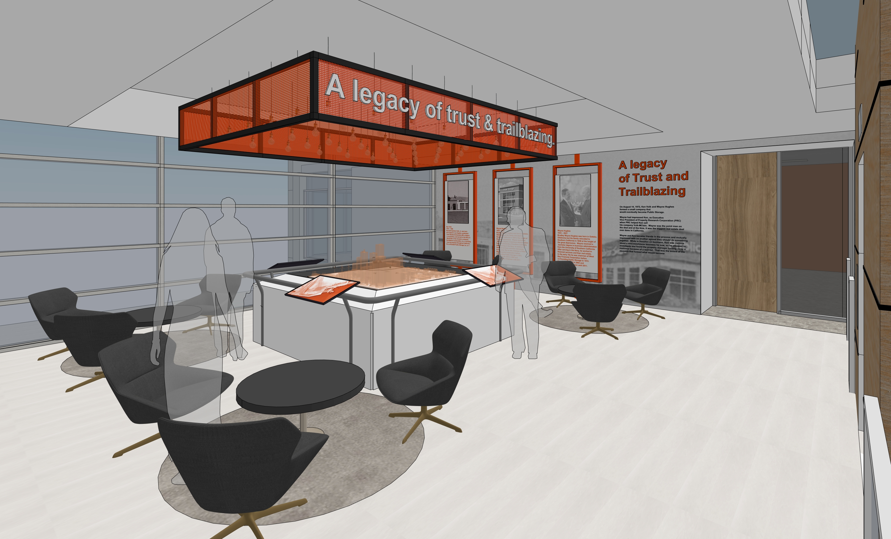 photorealistic interior polished tile floors white walls and light the space is lit up with soft ceiling soft lights back wall has black and white graphic and orange metal frames in front with graphics inside perforated metal orange panel box ceiling in the center bright lighting and overall environment is soft bright lighting view outside of clear glass of second story above looking down about 10 feet below aerial of parking lot with trees in the afternoon seating lounge furniture groups with coffee table and circular rug keep people silhouette as transparent shown but keep environment warm