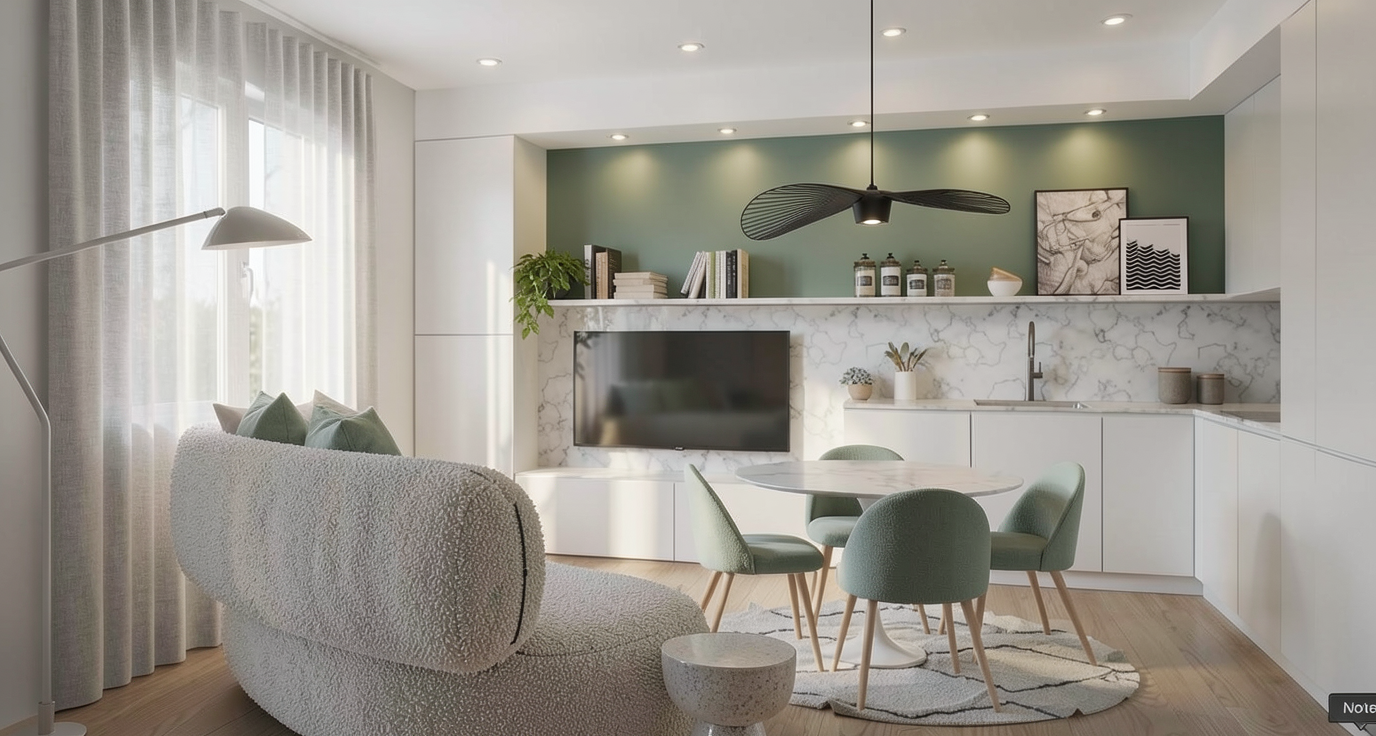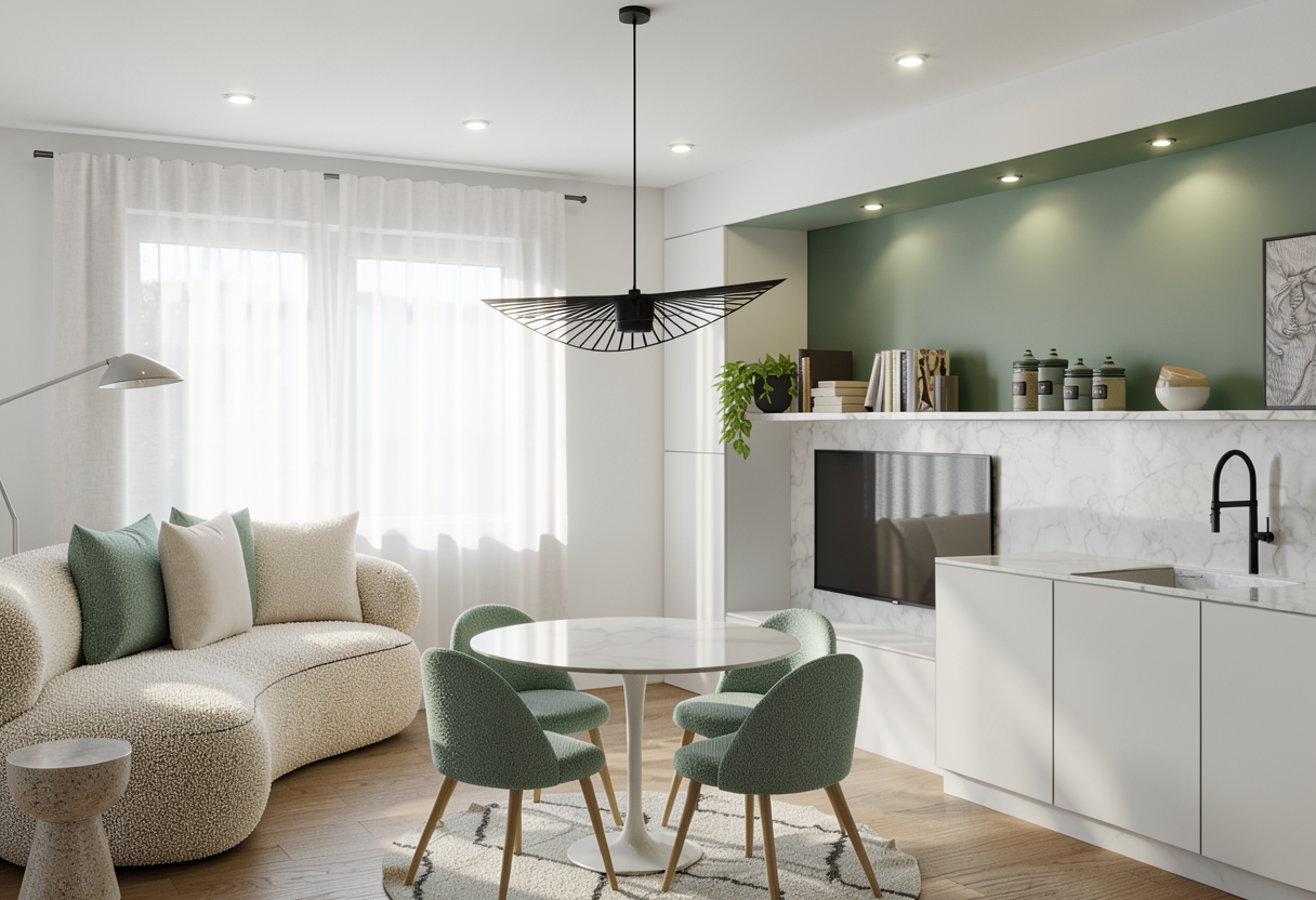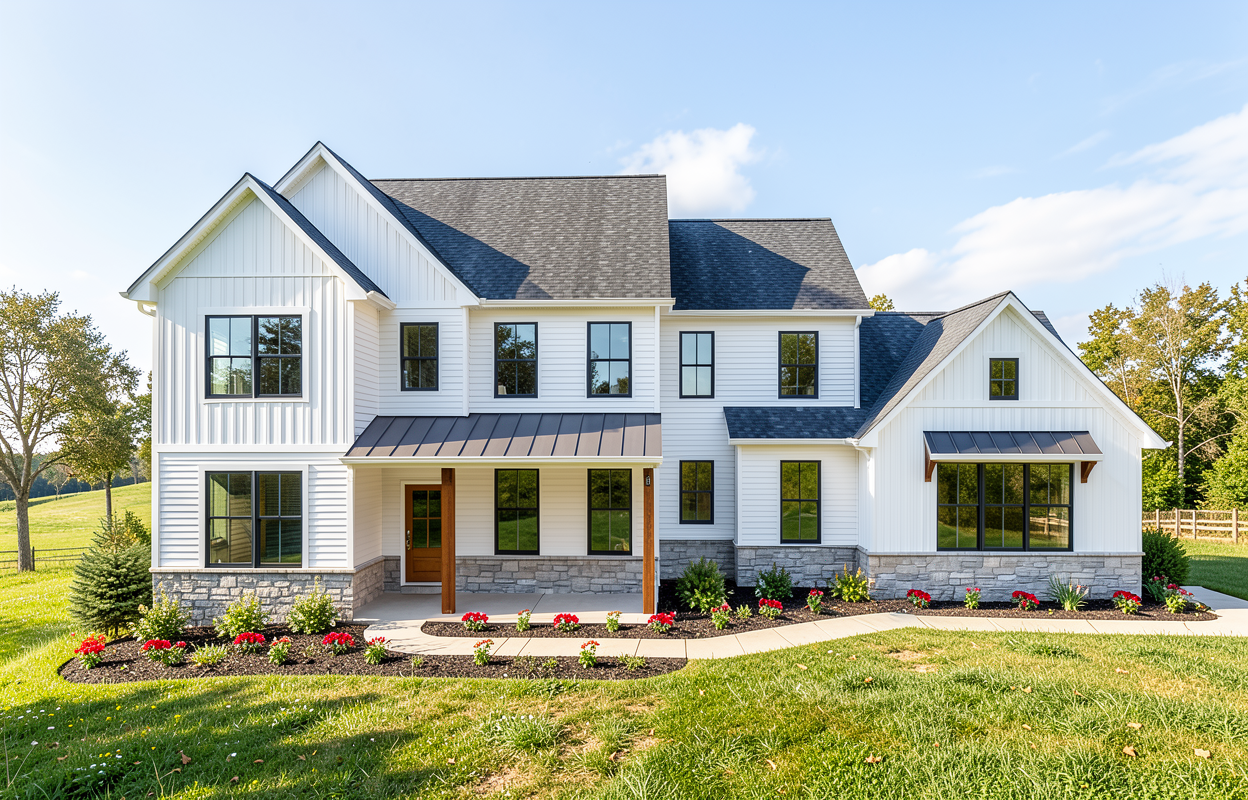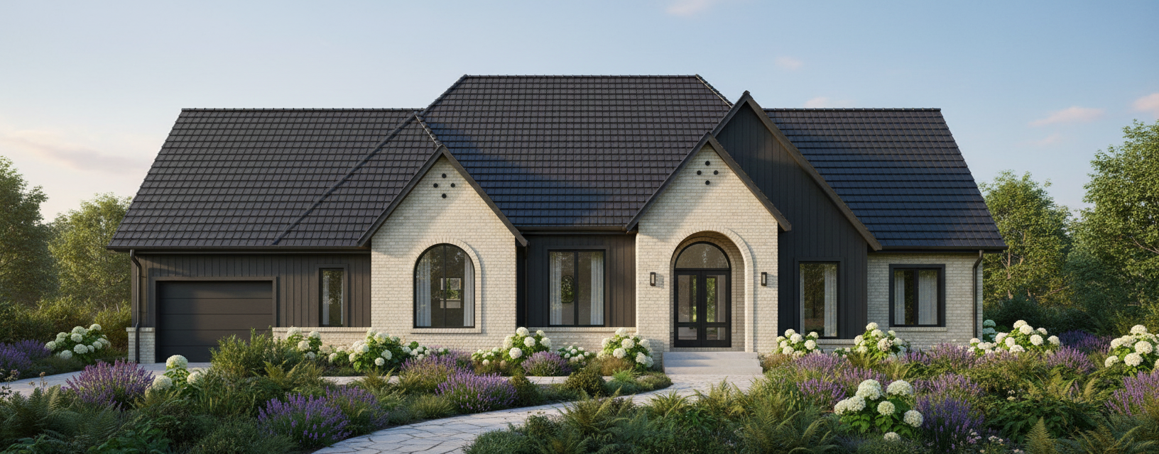 le corbusier exterior shot create front exterior render with a dark charcoal scalloped roof muted taupe vertical siding with creamy colored painted brick with black windows add full landscaping architecture