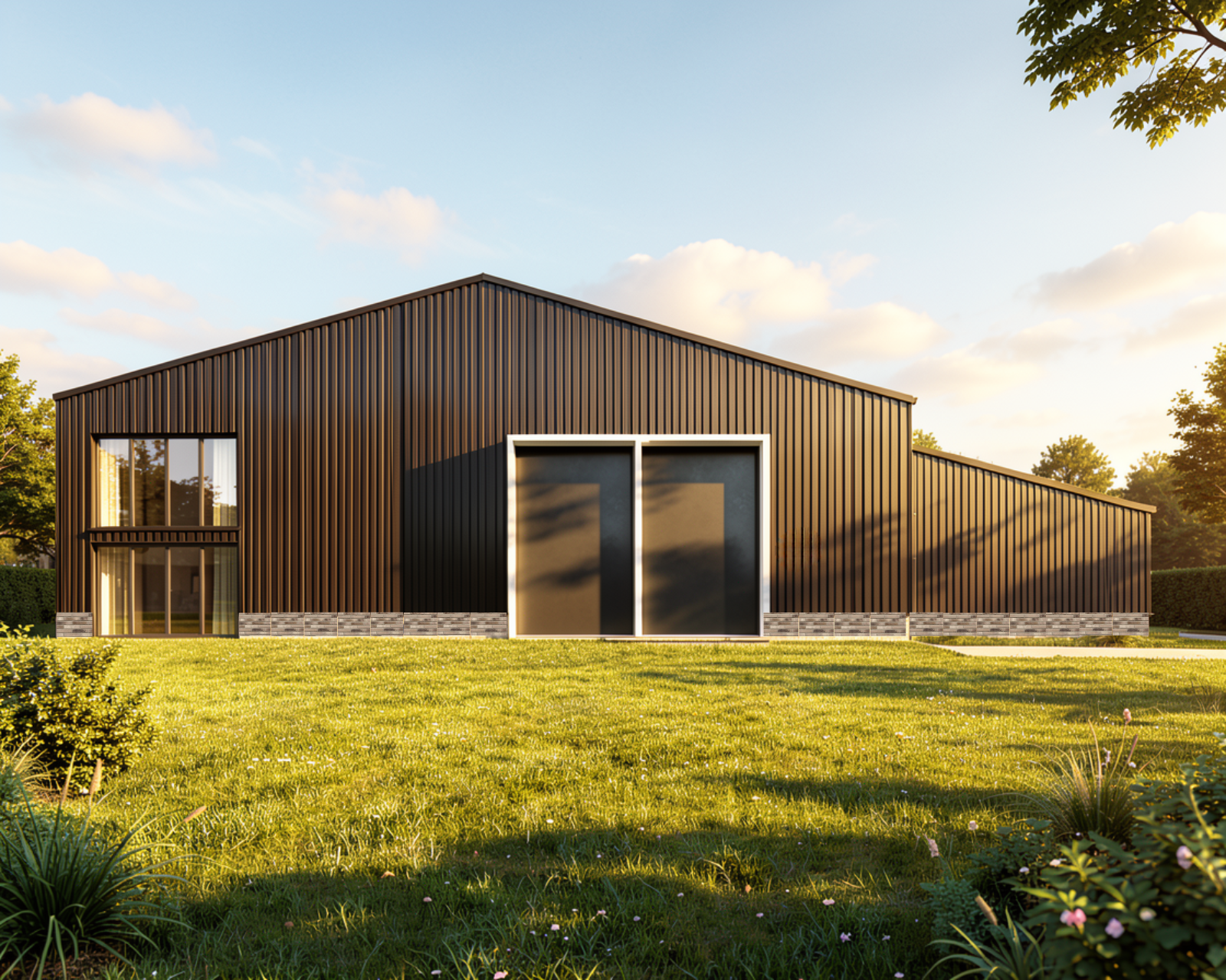 transform the building exterior by replacing the current facade with modern insulated horizontal cladding panels use dark graphite black color with a slightly textured surface and subtle horizontal grooves maintain realistic proportions depth and lighting ensure photorealistic finish high detail and seamless integration with windows doors and surroundings