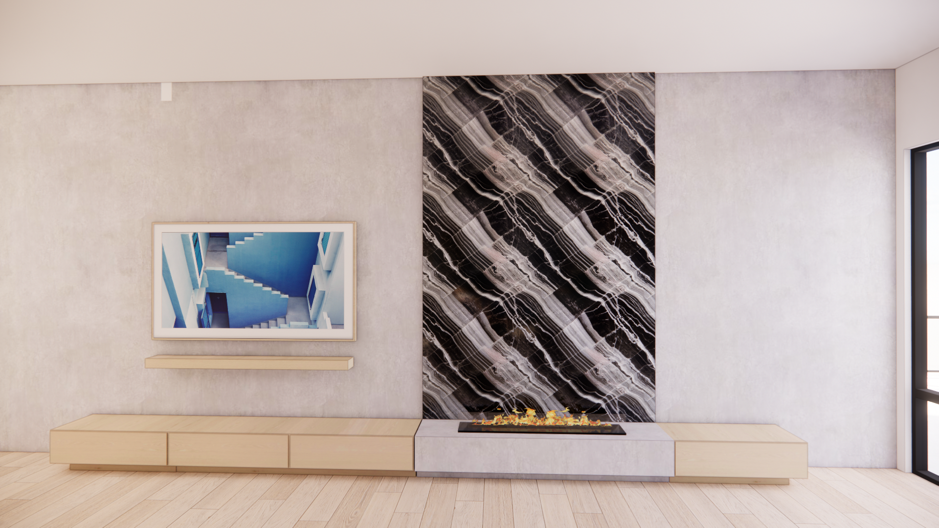add a couch and people sitting around the fire place add some decorations on the shelf under the painting