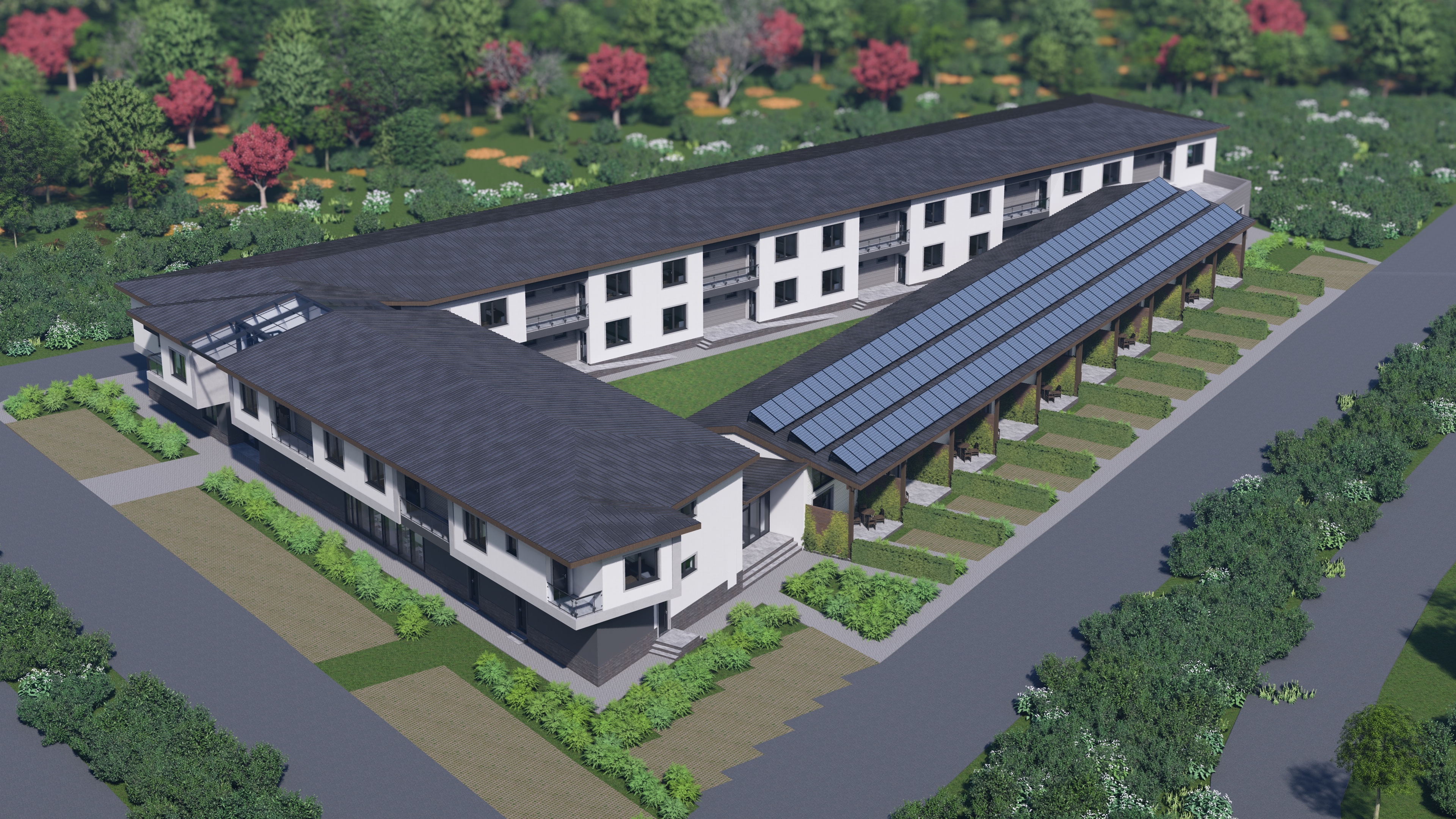 modern architecture building with a sleek design featuring large glass panels and wooden accents the building is surrounded by lush green shrubs and grass set against a vibrant blue sky with a few soft clouds the brick pathway in the foreground contrasts elegantly with the building s neutral tones the atmosphere is serene and inviting capturing the essence of a bright sunny day use deep blues for the sky rich greens for the foliage warm browns for the wood and soft whites and greys for the building s facade