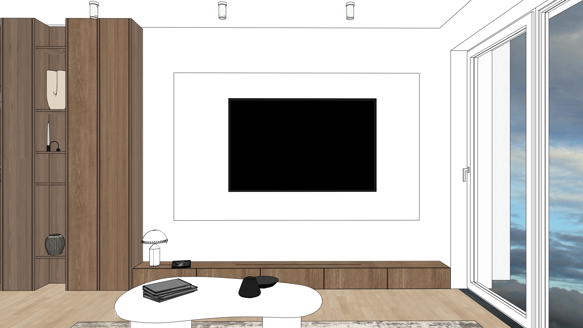 transform the input interior design photo into a hyper realistic architectural visualization of a contemporary modern interior preserve exact geometry layout proportions and material intent from the original design lighting create soft overcast daylight atmosphere similar to a cloudy rainy day without visible rain with diffused natural light entering through windows add warm artificial lighting from all lamps accent led backlighting behind the tv subtle ambient glow to enhance depth and spatial layering maintain balanced contrast no harsh shadows no overexposure materials textures enhance material realism micro details surface imperfections soft reflections accurate roughness physically correct light response emphasize textures wood grain fabric weave stone concrete metal and matte finishes high micro contrast and tactile depth rendering style ultra photorealistic architectural visualization cinematic quality natural color grading neutral tones soft highlights realistic global illumination physically based rendering high dynamic range premium interior photography style camera composition wide angle architectural lens natural perspective eye level viewpoint deep focus sharp details across the frame natural framing no distortion atmosphere calm elegant contemporary premium residential mood clean minimal refined without visual noise output 8k resolution ultra detailed noise free crisp edges professional architectural rendering quality negative prompts no rain droplets no lens flares no fog no haze no bloom no motion blur no cartoon no stylization no oversharpening no artificial glow no unrealistic reflections no distortion no clutter