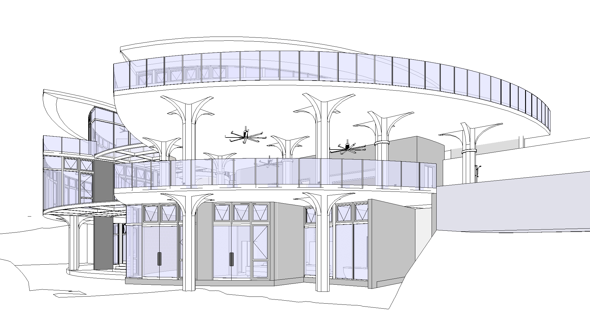 can you make the feature columns concrete material the house is predomintly concrete and glass can you add people and landscaping the house is set on a sloping side in a tropical setting