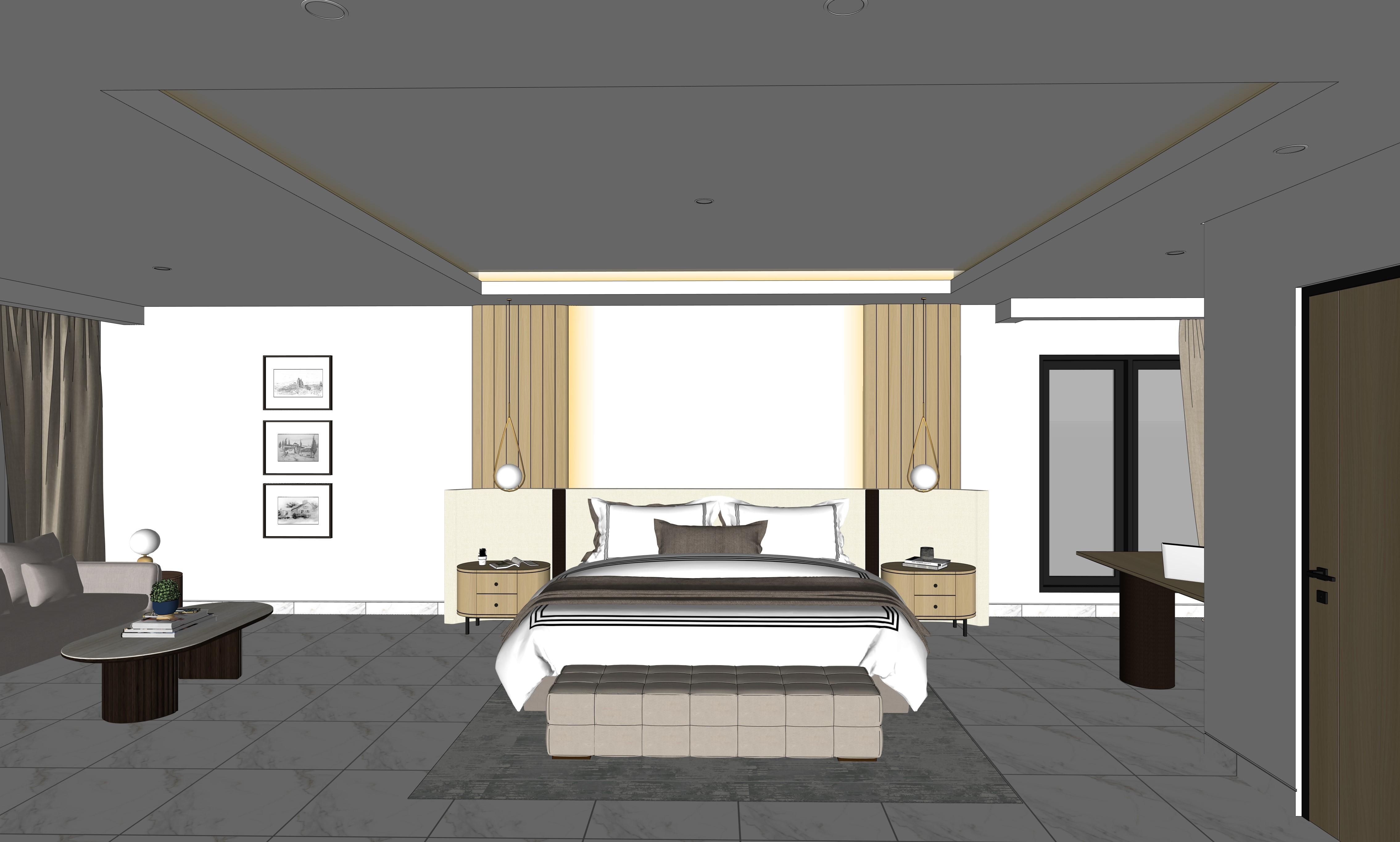 create a luxurious modern bedroom interior featuring light oak wood cabinetry and shelving with integrated lighting for a warm ambiance the walls are adorned with soft white finish enhancing a minimalist aesthetic the bed is dressed in silky white linens with gray accent pillows and a charcoal throw a cozy soft beige lounge sofa complements the dark wooden coffee table below adorned with magazines and a small green plant the flooring is a polished white marble tile reflecting subtle lighting from the sophisticated white ceiling design which includes recessed lights and a soft glow along the edges the atmosphere is serene and elegant with a hint of modern sophistication ideal for relaxation and tranquility