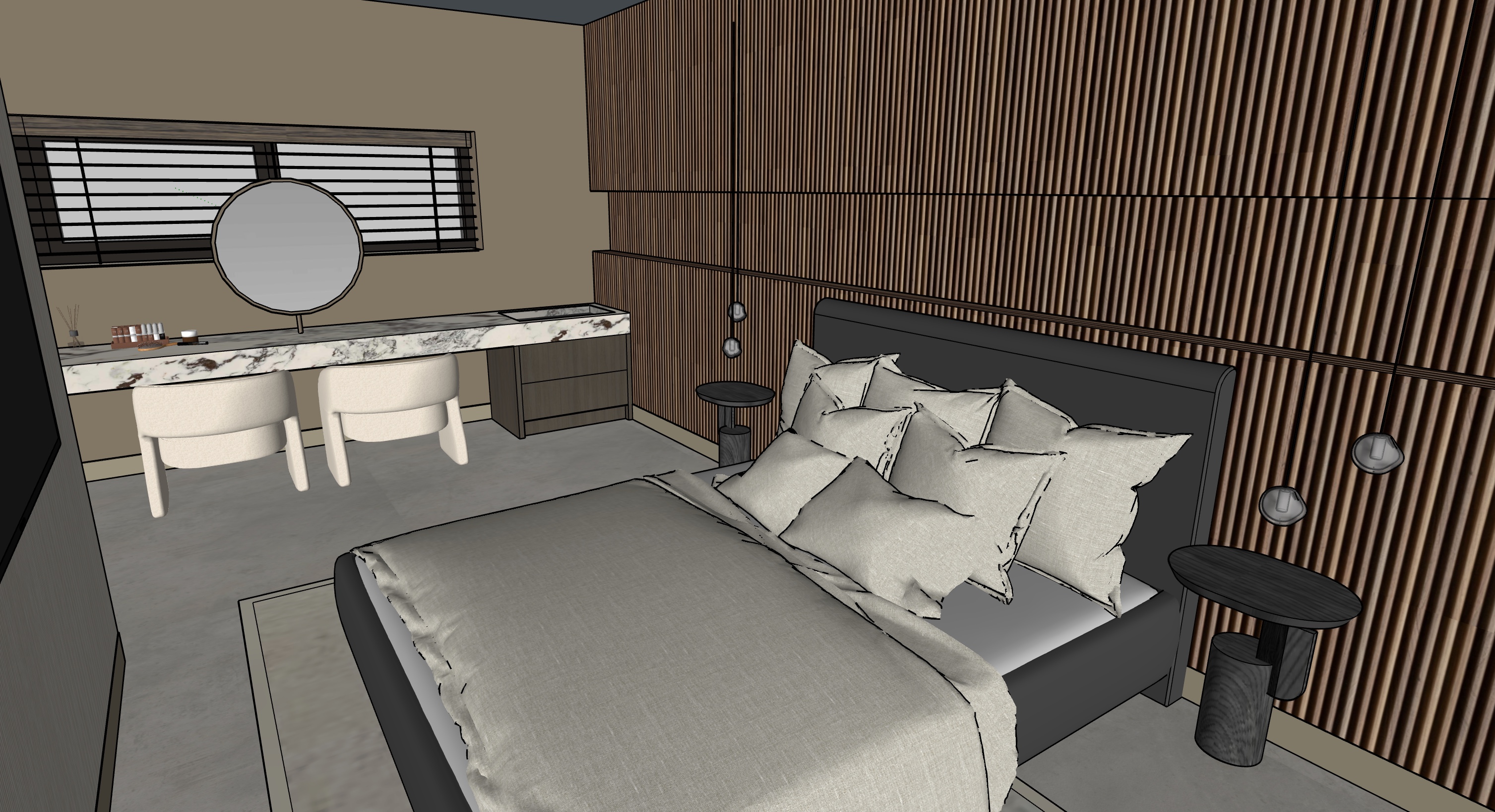 render of the 3d model retain the original colors soft natural light the floor is a concrete floor without gloss a clean marmer desk with a dark wooden build in storage underneath