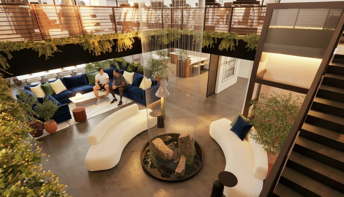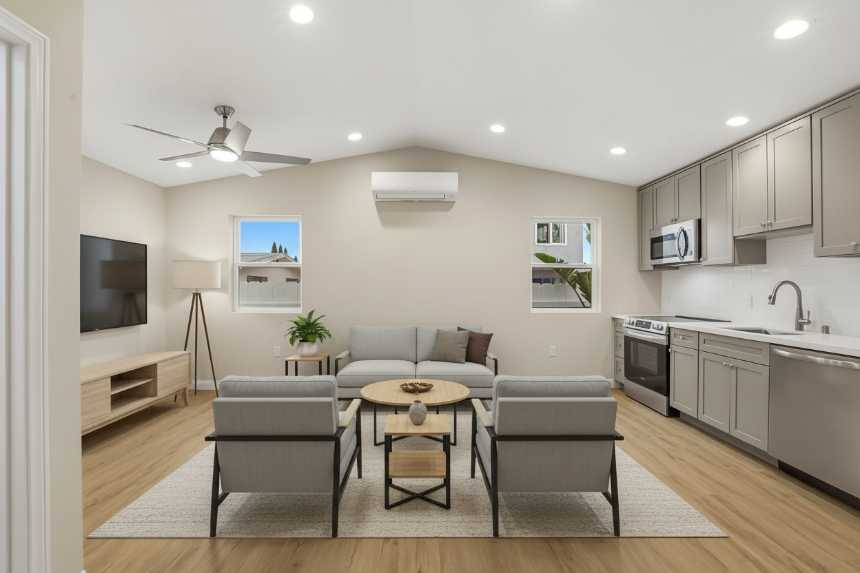 keep the tv lamp and console table remove all the other furniture replace with a sofa facing the tv and a dining table immediately behind the sofa the table should be butting against the sofa