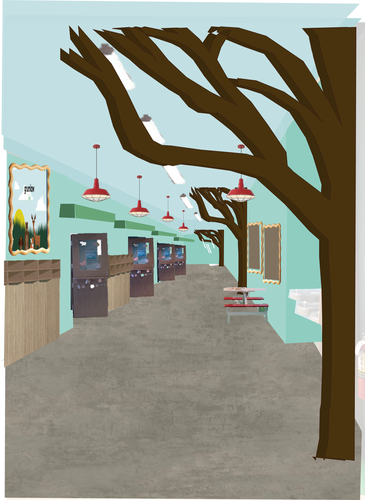 whimsical kids hallway keep colors true light whimsical blue ceiling industrial trees are wooden 2d art sculptures bright space with little natural light