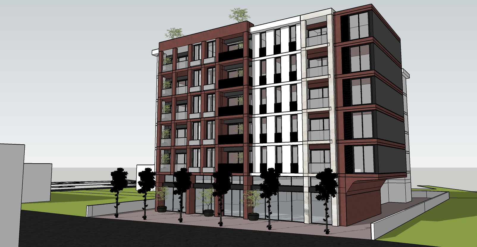 photo realistic architectural rendering of a contemporary mid rise residtential building with a facade terracota plaster deep balconyclean geometric line integrated greenery on each level glass windows clear soft daylight clear blue sky and realistic shadows green roof depth of field