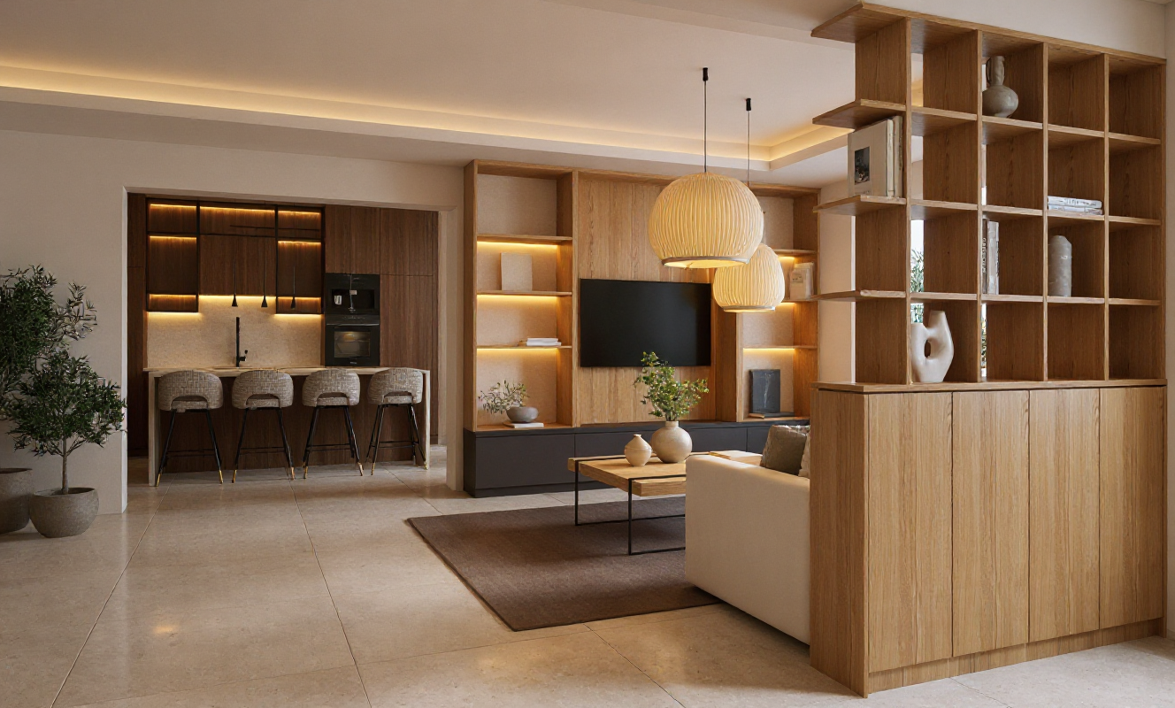close up shot a realistic rendering of a modern floor lamp in a warm contemporary interior e g a living room with wooden floors and soft lighting the base consists of two half moon shapes made of natural stone showing subtle veining and texture the vertical stand is a brass h profile with gentle metallic reflections the lampshade is made of papier m ch featuring a soft organic texture and a semi translucent look the environment should enhance the materials realistic shadows soft indirect lighting and a neutral background so the lamp remains the focal point